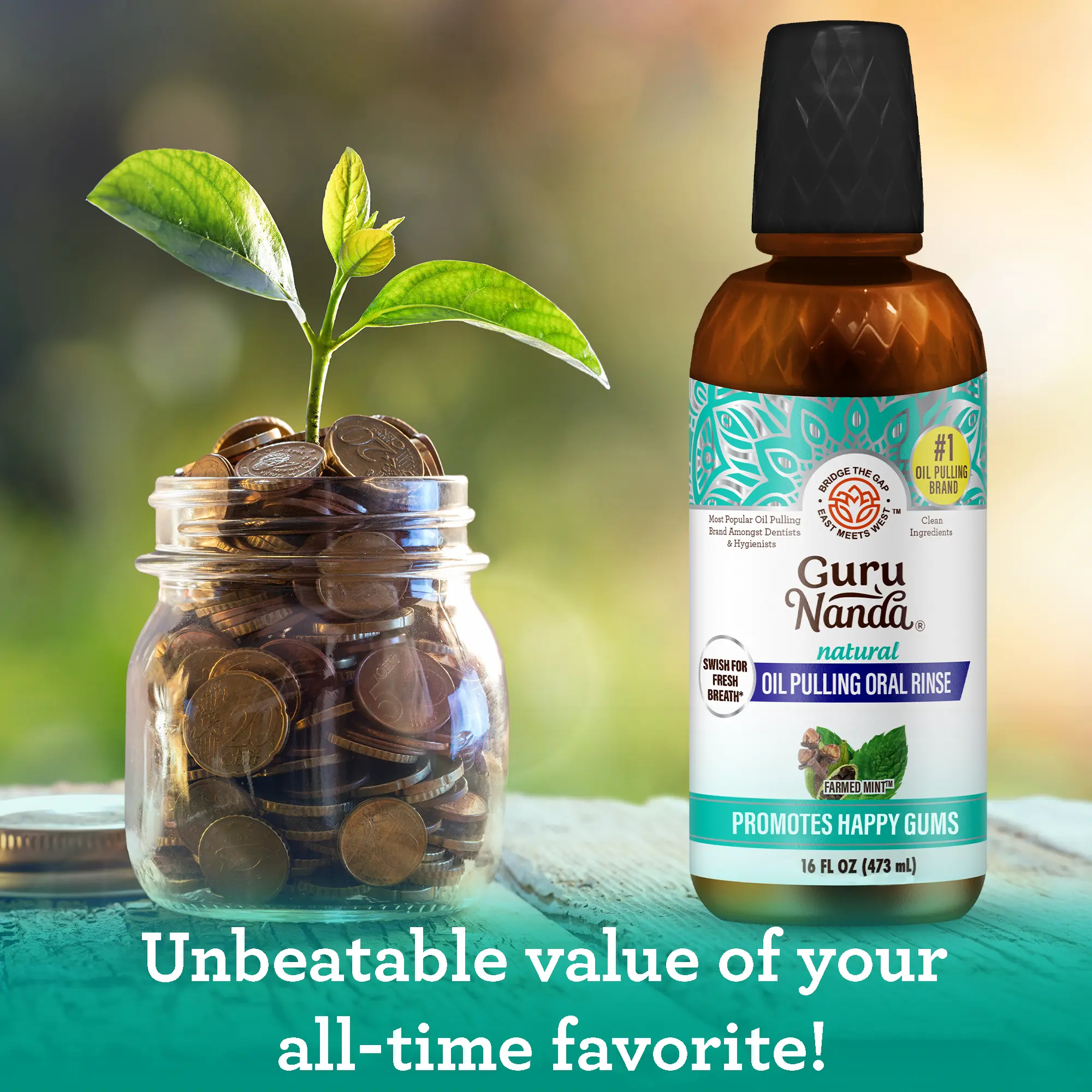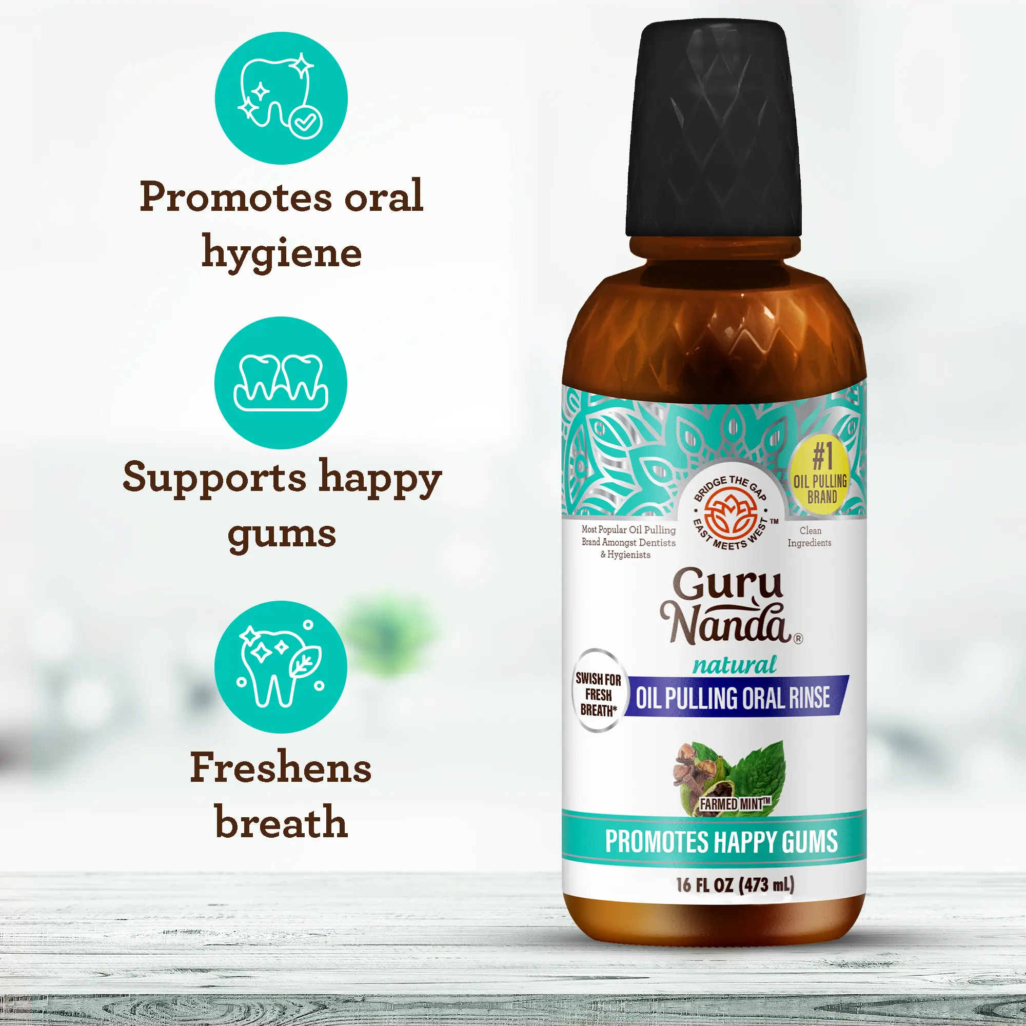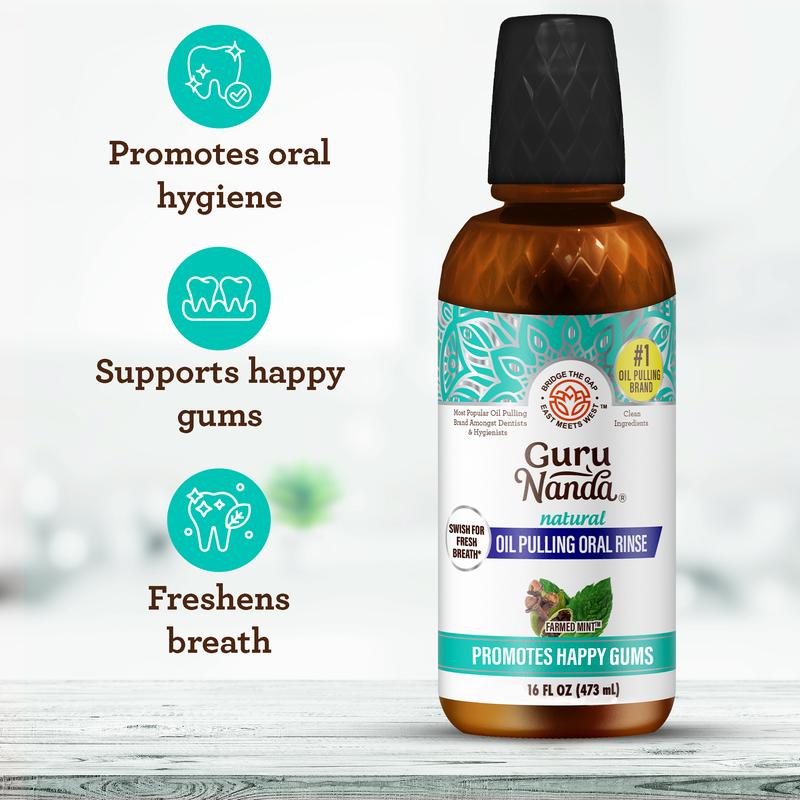 *GuruNanda oil pulling is a pre-brush rinse with less density than coconut or sesame oil; thatâs hydrophobic and lipid inspired heavily by Ayurvedic knowledge. Itâs a preventative measure and it is not a replacement for your dentist, nor does it cure active dental problems including but not limited to infections, deep cavities, gingivitis, etc.