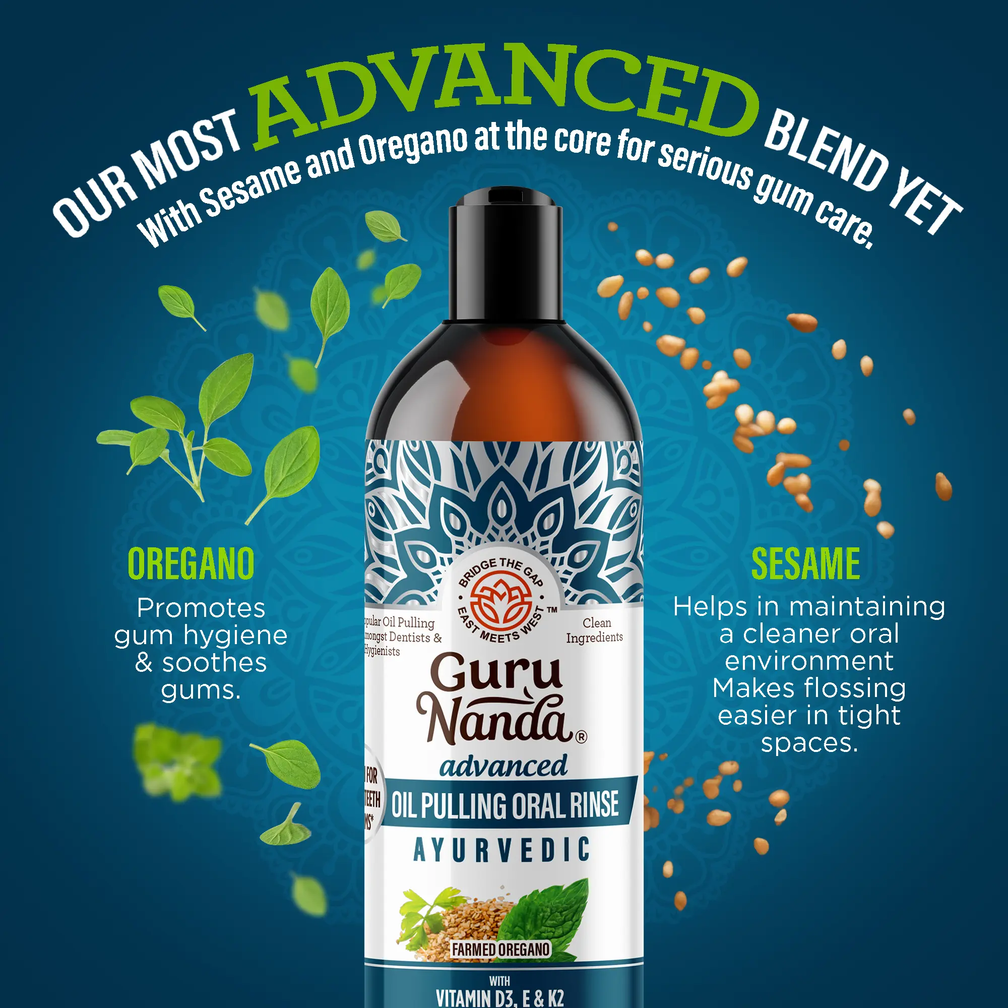 Building on the success of our Original Pulling Oil, GuruNanda’s Advanced Formula Pulling Oil makes natural oral hygiene easier than ever. Our team of Western and Ayurvedic oral health experts has added even more natural ingredients to our formula: Vitamin D, Vitamin E, and pure, natural essential oils sustainably harvested from the best farms the world over. Full ingredient list below.