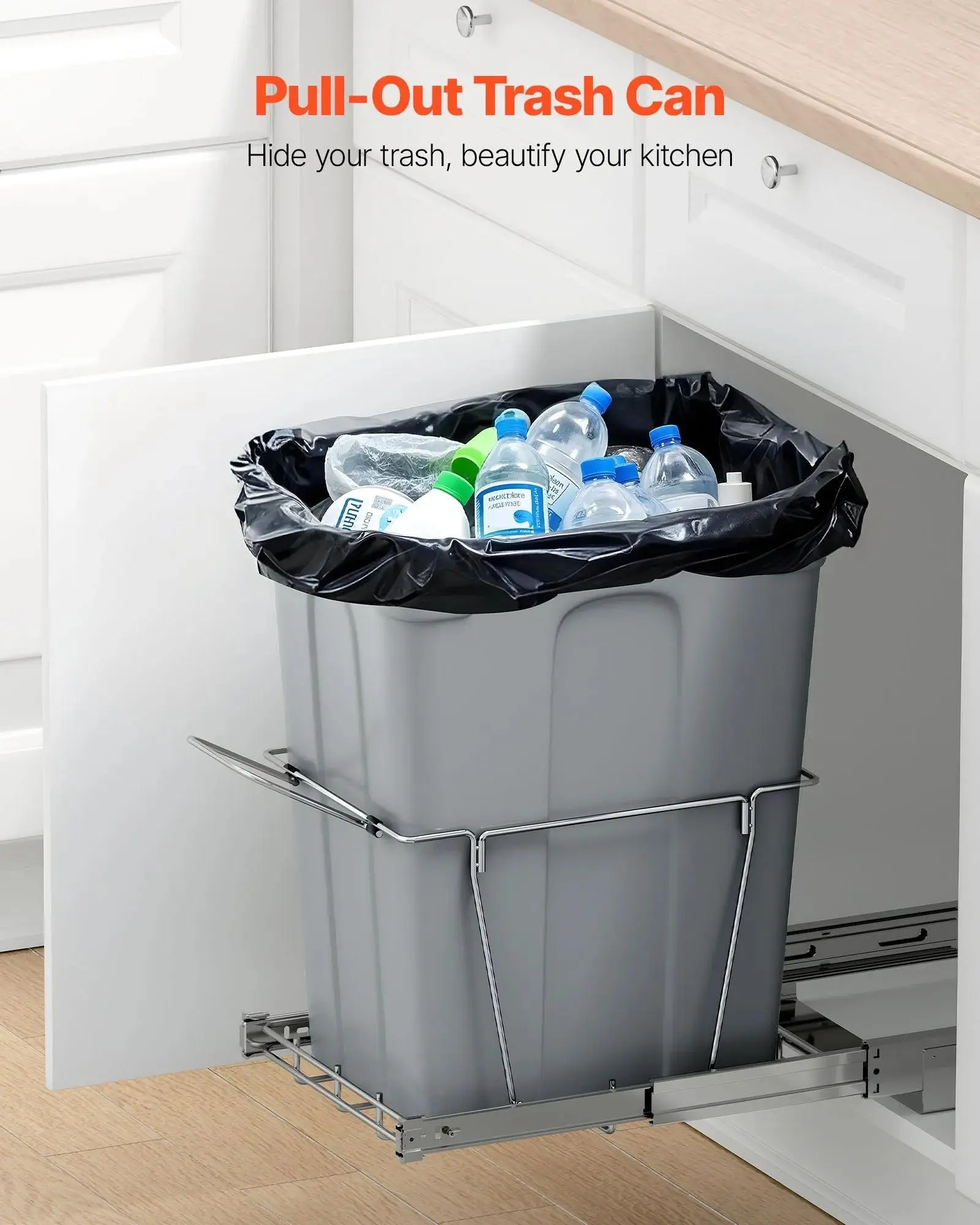 The under-cabinet trash can features a handle for convenience. Simply pull it out of the bottom cabinet. The smooth sliding track ensures quiet operation, avoiding direct contact with garbage and maintaining hygiene.