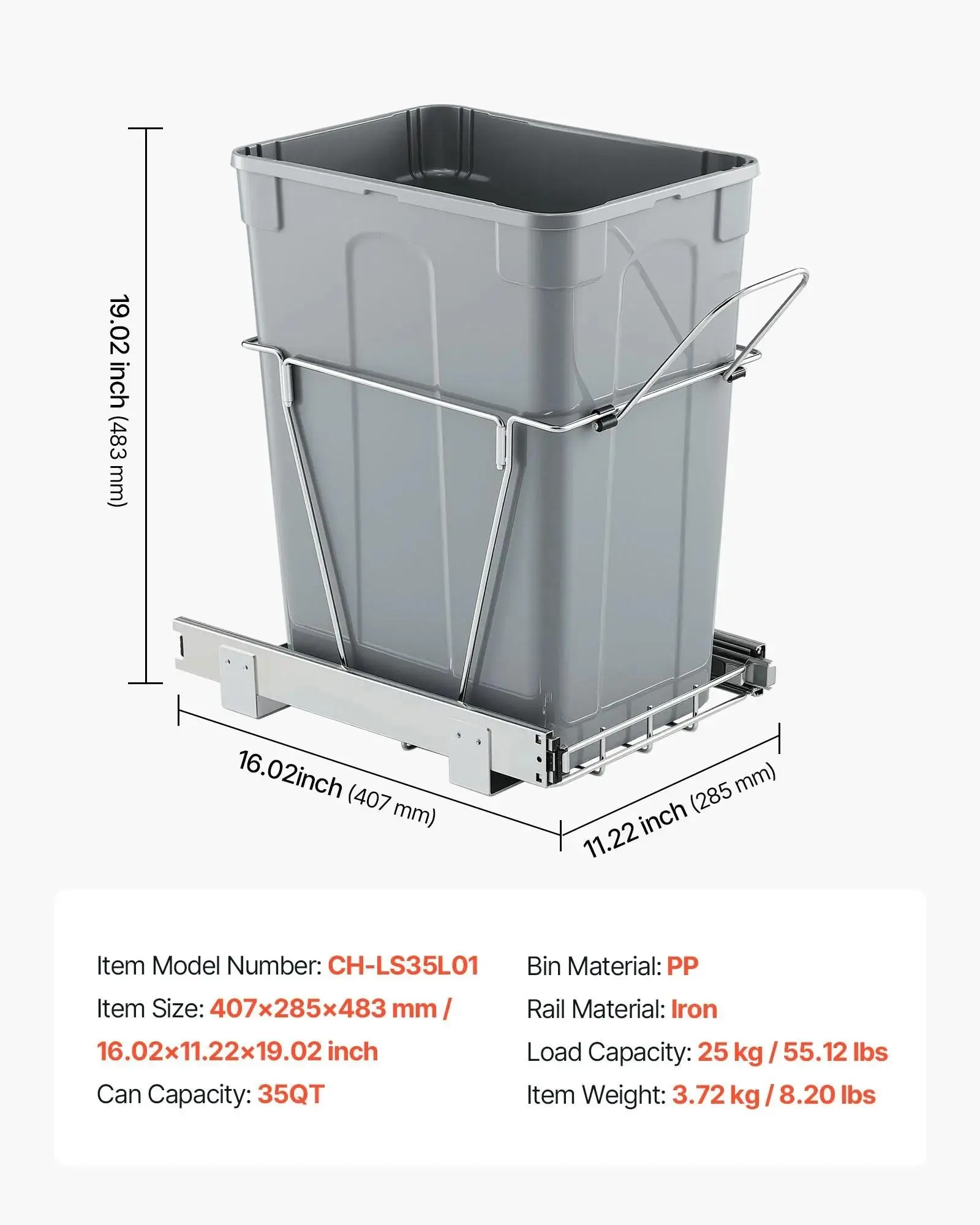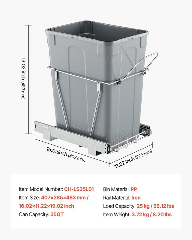 Equipped with a 35QT capacity, this trash can handles both home and commercial waste. It can carry up to 30 kg / 66.14 lbs effortlessly. Bottom installation allows for smooth sliding in and out, eliminating the hassle of frequent trash disposal.