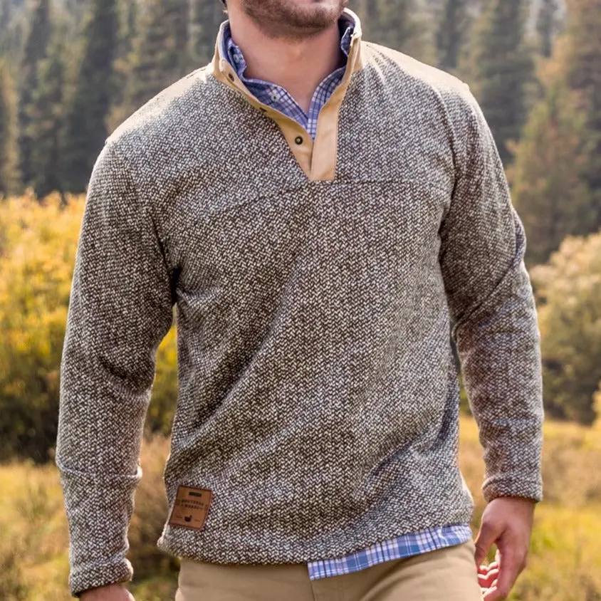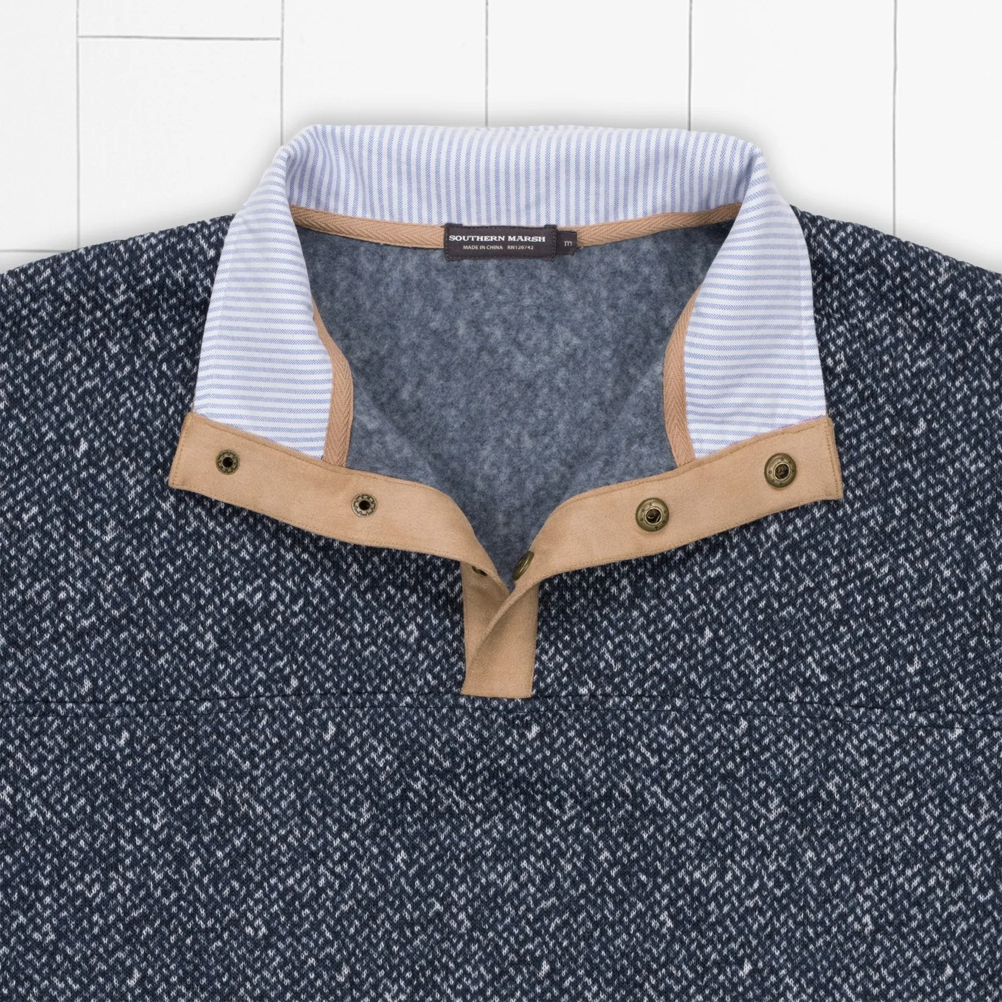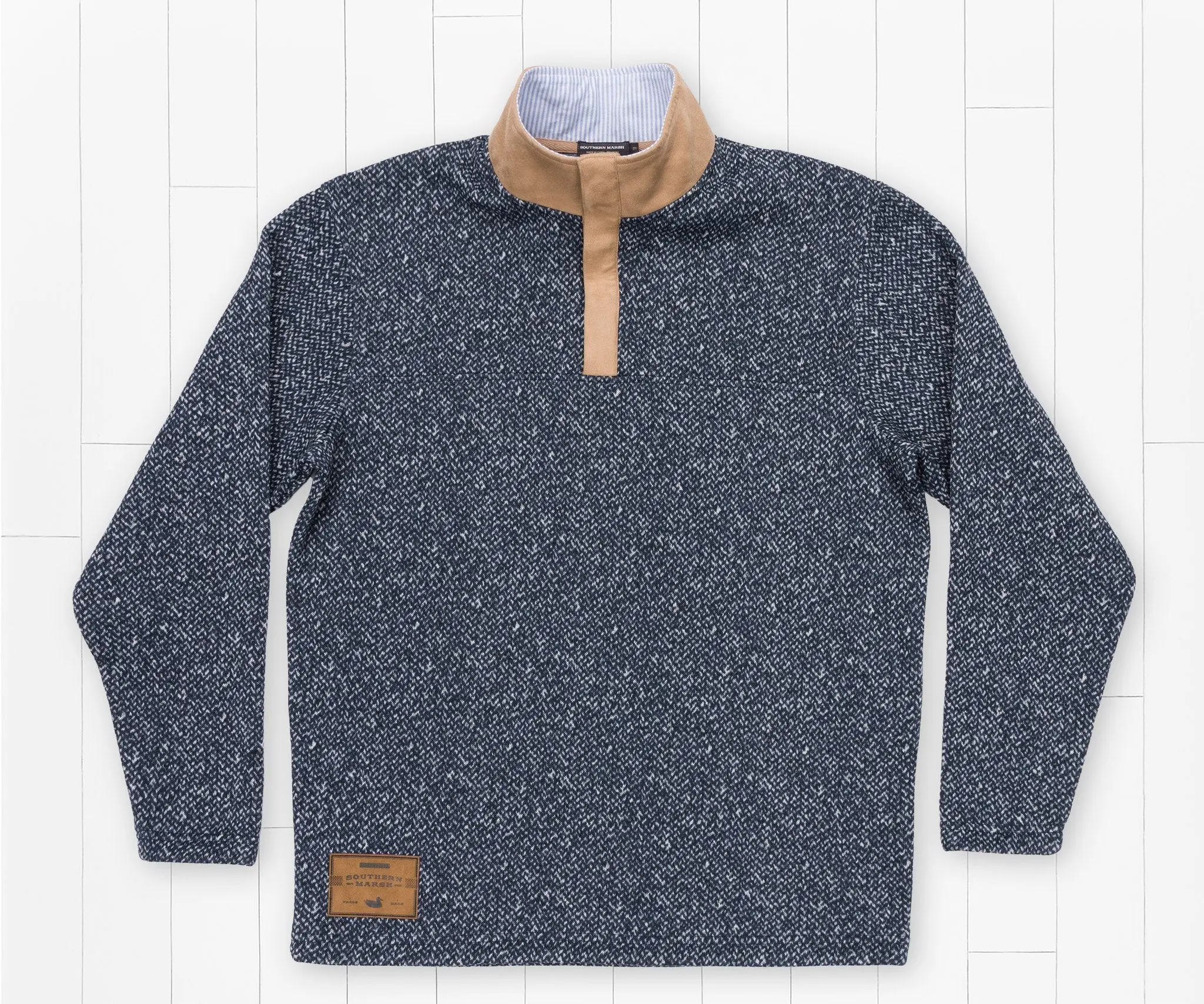 The Cascade Pullover combines classic herringbone patterns with striped oxford cloth accented by a suede placket creating a timeless combination that we’re sure you’ll love. Finished off with a custom Southern Marsh patch and bronze snap buttons.