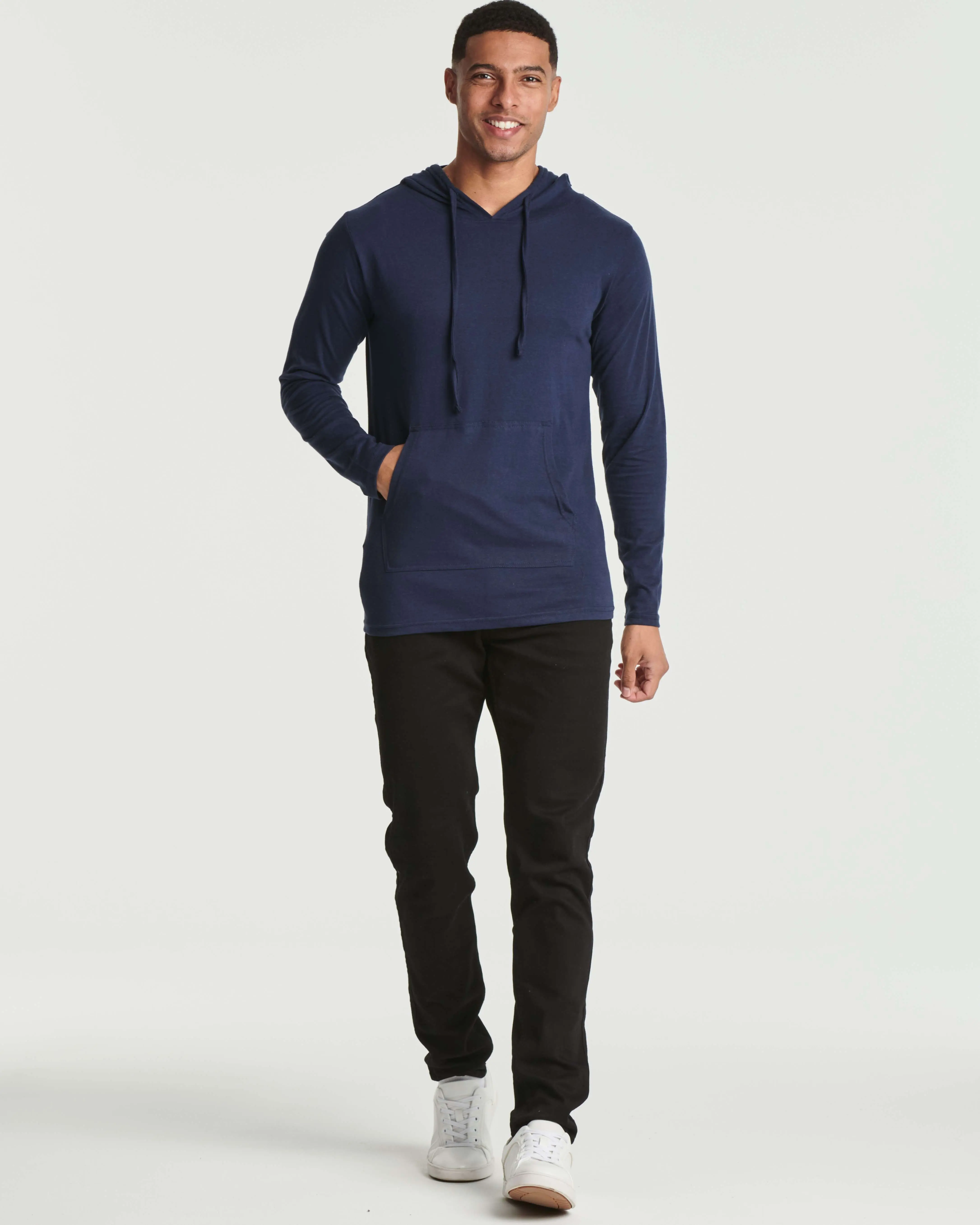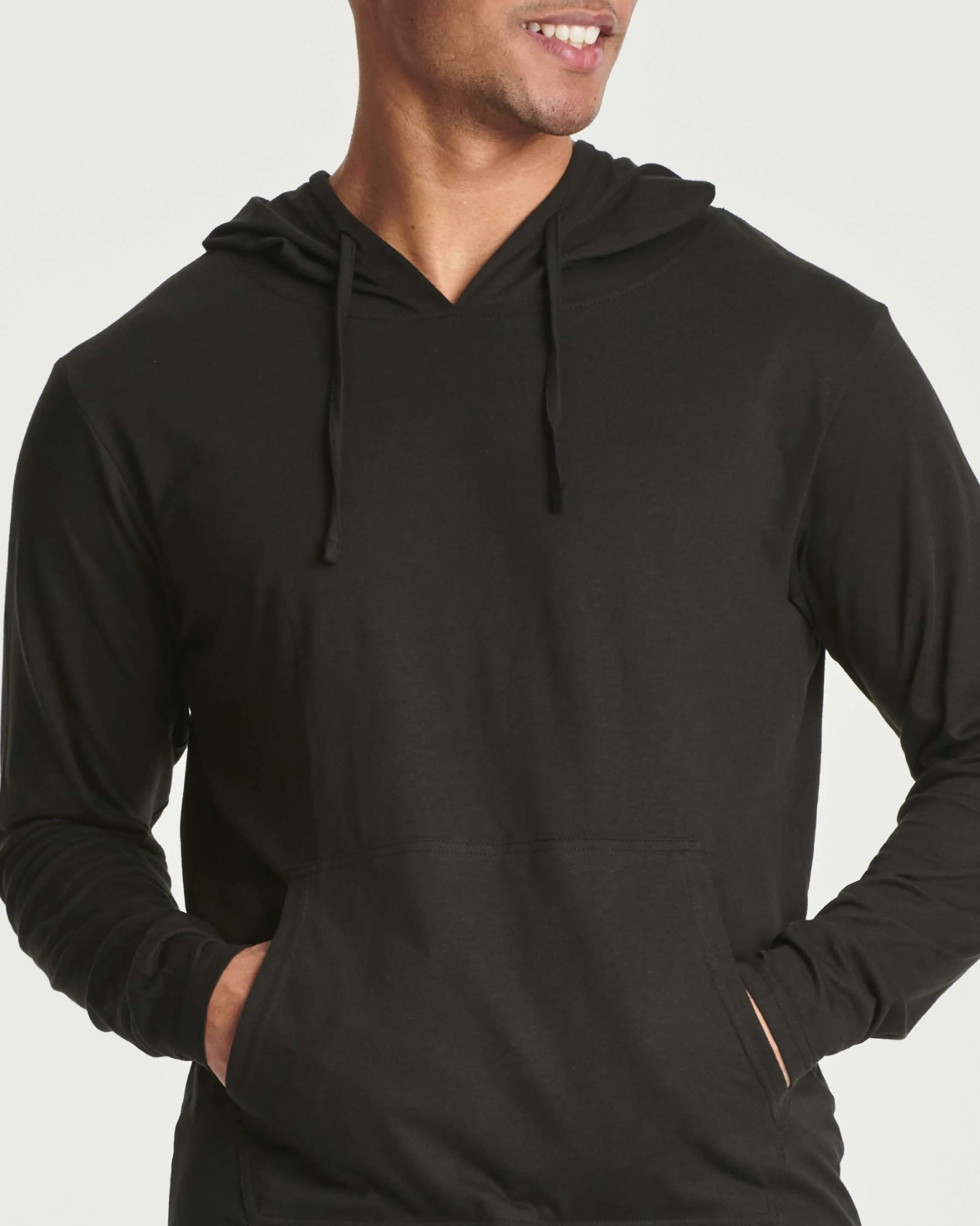 -This pullover t-shirt hoodie in lightweight slub cotton features a self drawstring and a kangaroo pocket.