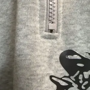 The material is thin, but soft. Zipper is like a grayish purple. On the zipper down at the bottom in the picture shown, there’s a hole in between the fabric and where the zipper starts. I was very excited to receive this. I’m kind of disappointed. I did order a small and it does run large.