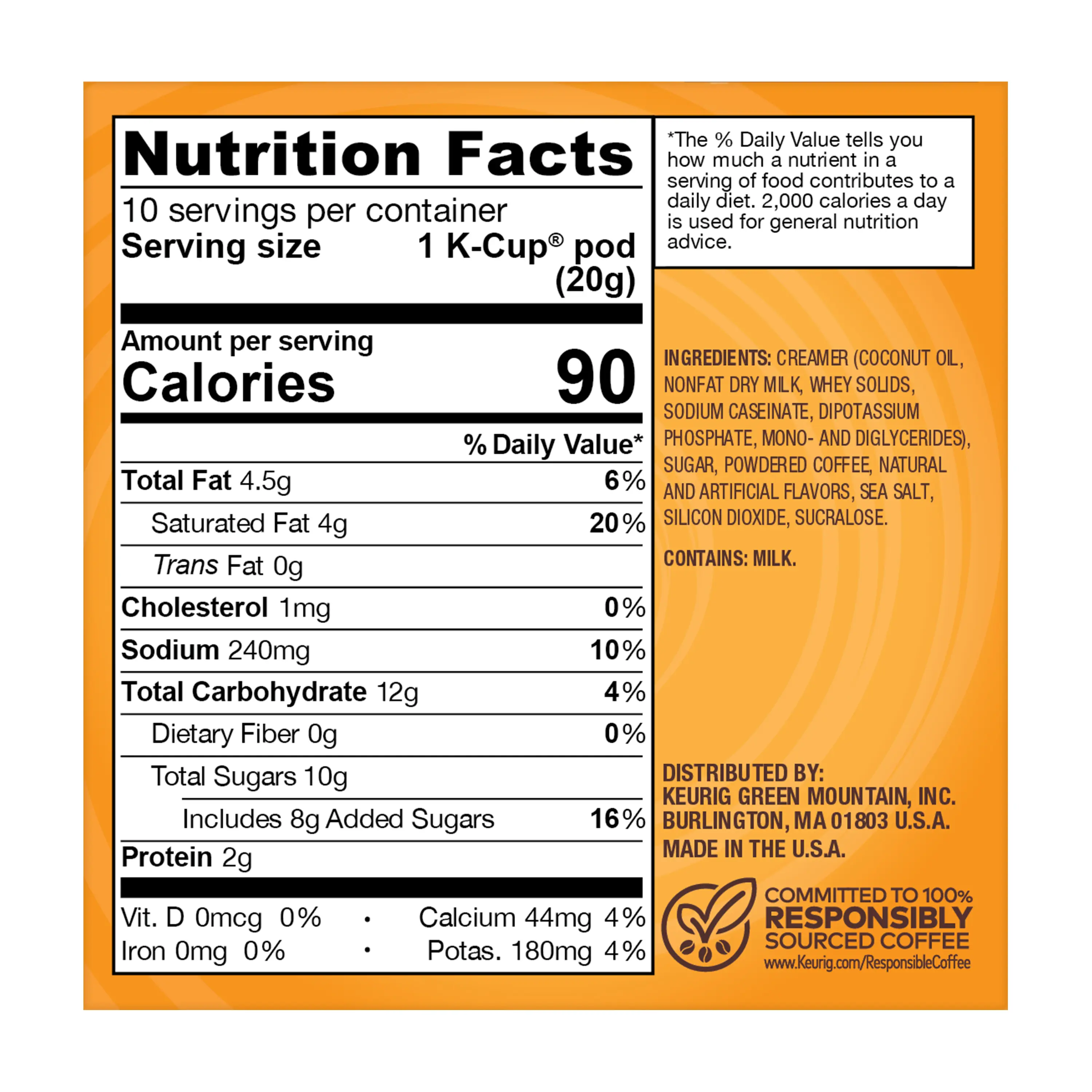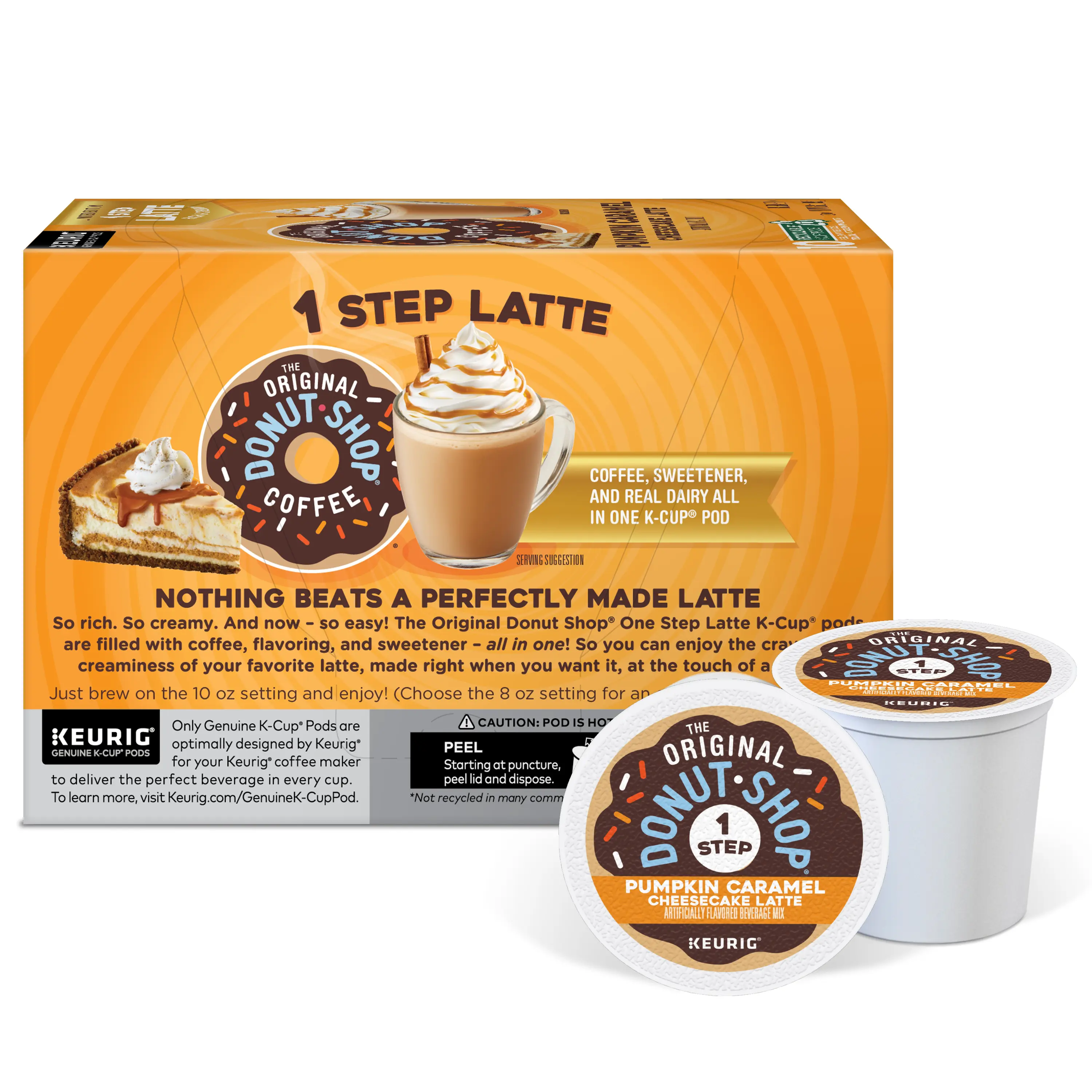 These single-serve K-Cup pods are compatible with all Keurig K-Cup Pod Single-Serve Coffee Makers and brew up to 12 oz coffees each. Each K-Cup pod is filled with the freshest ground coffee and brews a perfect, great-tasting cup of coffee every time. Since our coffees are Certified Orthodox Union Kosher and recyclable in some communities, you can feel even better when enjoying The Original Donut Shop Pumpkin Caramel Cheesecake Latte.
