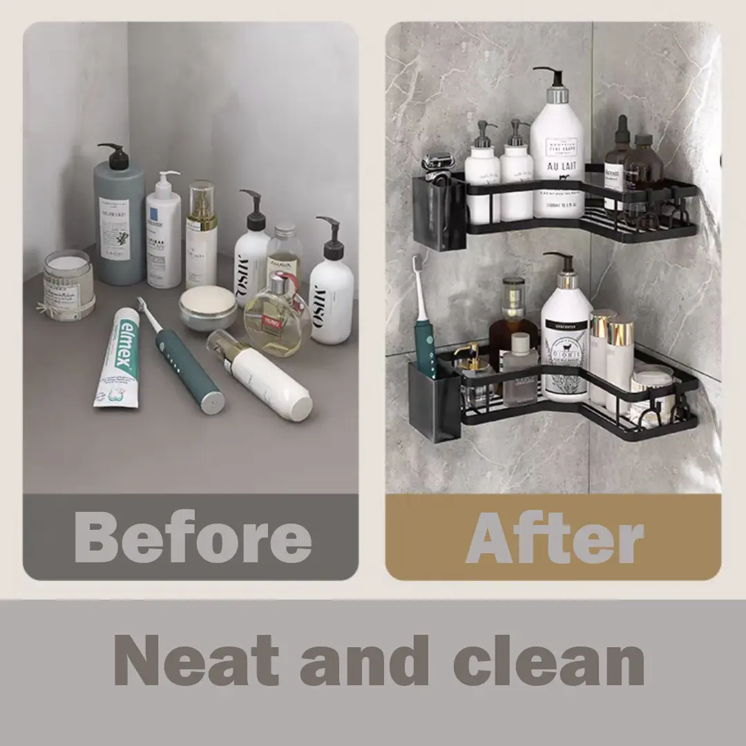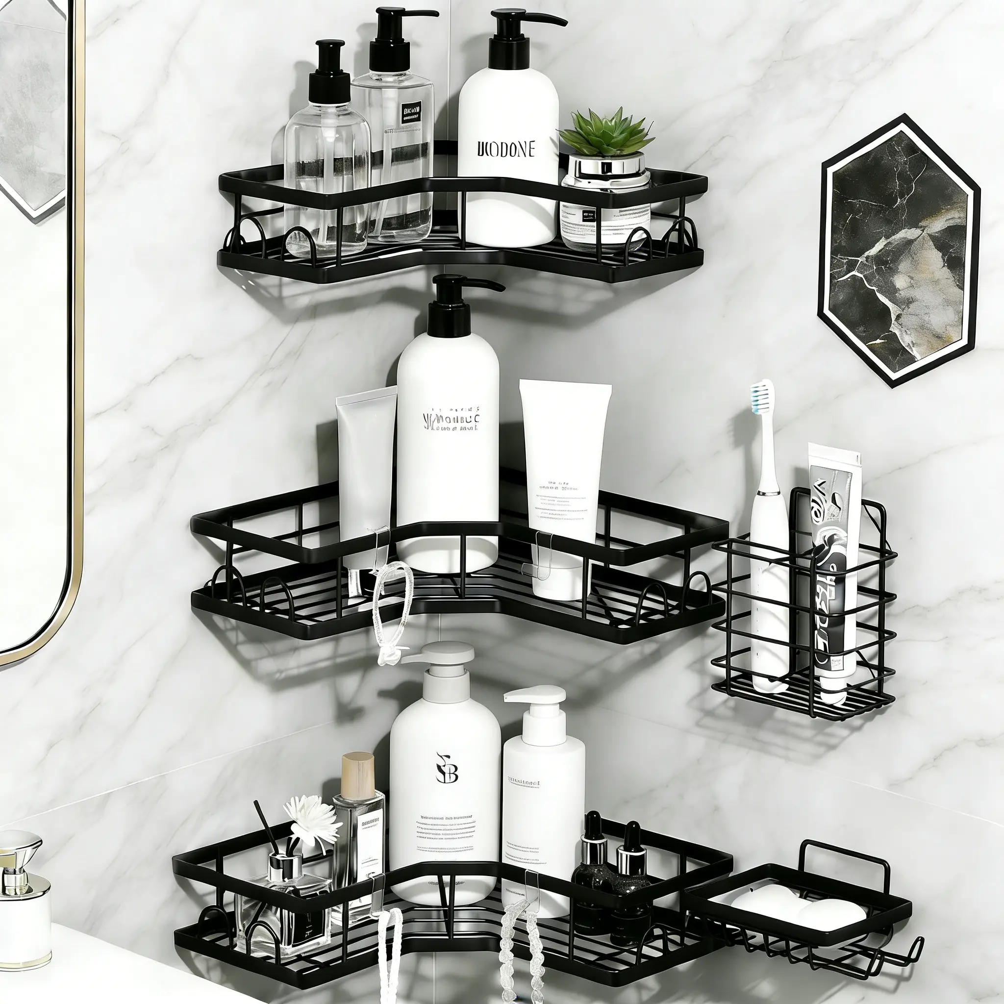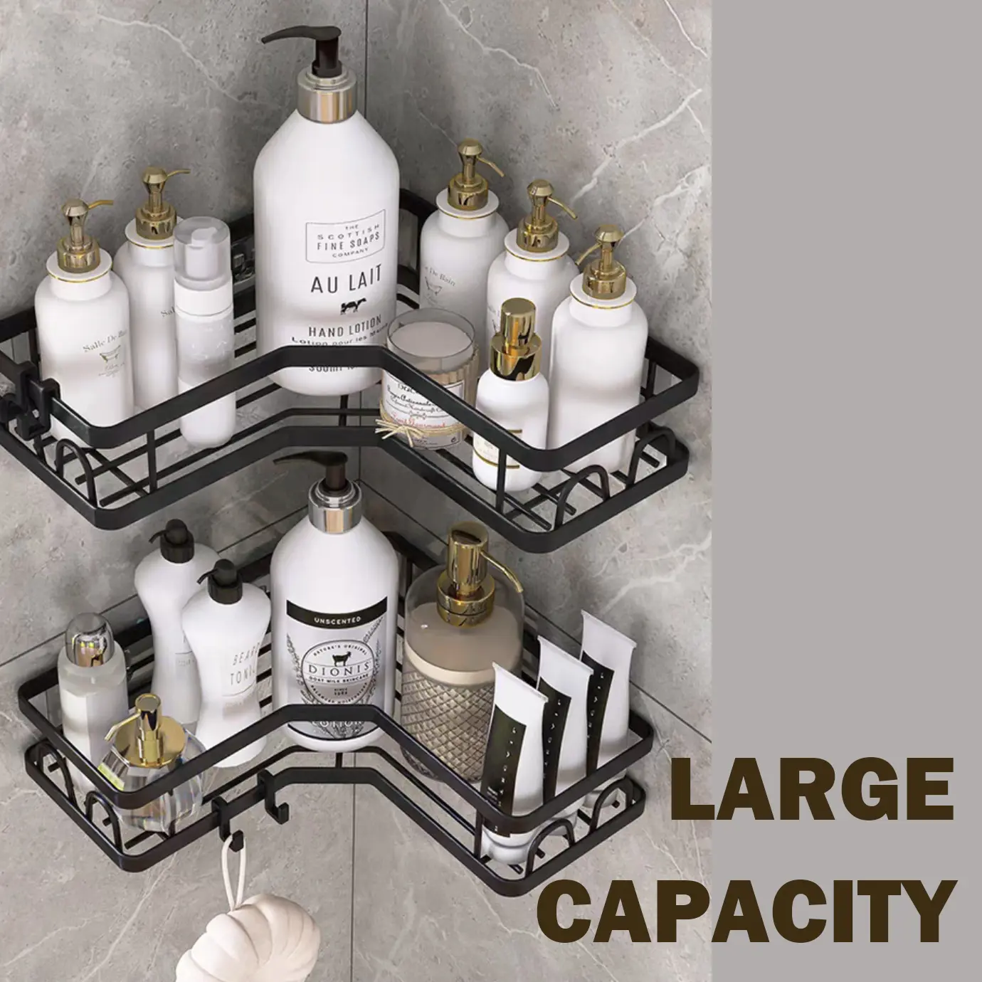 This wall-mounted iron corner storage rack offers a hassle-free setup. No drilling required, making it easy to install in any bathroom or kitchen. It's a quick and convenient storage solution for those seeking versatility. This storage rack is a must-have home goodie. It serves as a versatile storage organizer kit, suitable for various needs in your bathroom or kitchen.