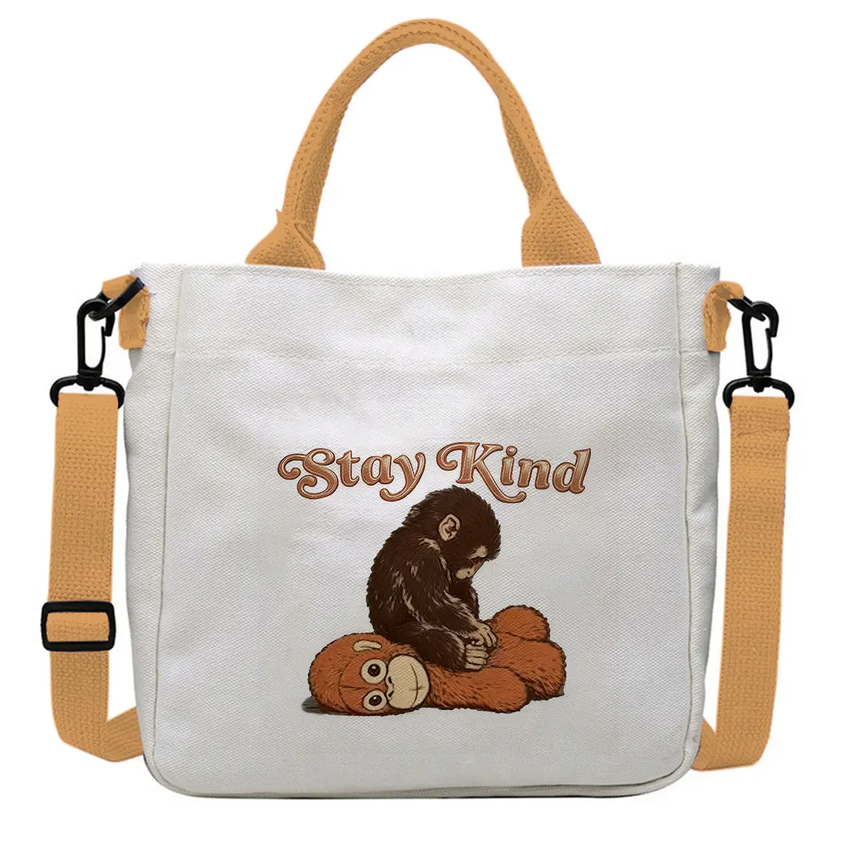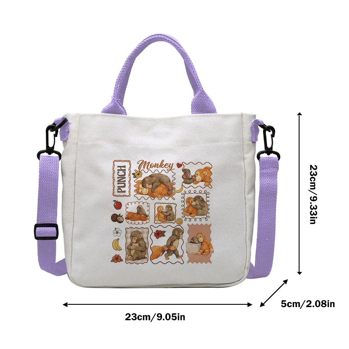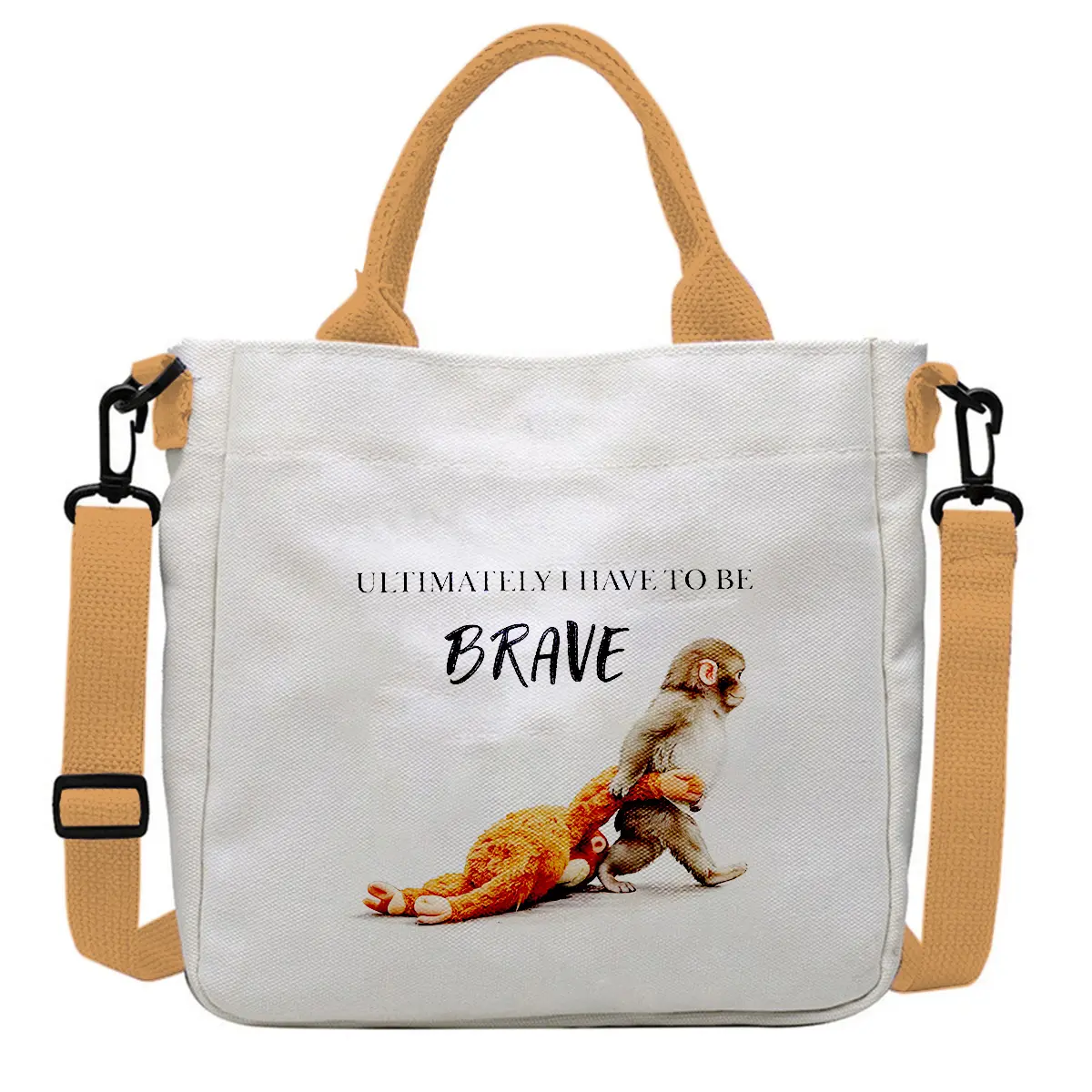 The Punch Monkey Canvas Shoulder Bag is a funny "Be Brave" graphic crossbody tote. Perfect for daily use, it serves as a 9-inch daily work purse. This bag combines functionality with a playful design, making it a standout accessory. Ideal for those who appreciate a touch of humor in their everyday carry.