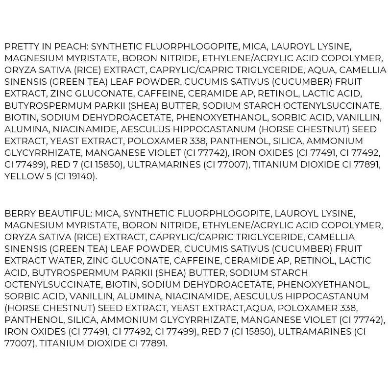 This soft, buildable blush coverage complements all skin tones. With complexion-boosting skincare ingredients to help improve the look of skin (like green tea, cucumber, vitamin B, and ginseng), results provide a more youthful-looking appearance. This time-released formula can be used both day and night.