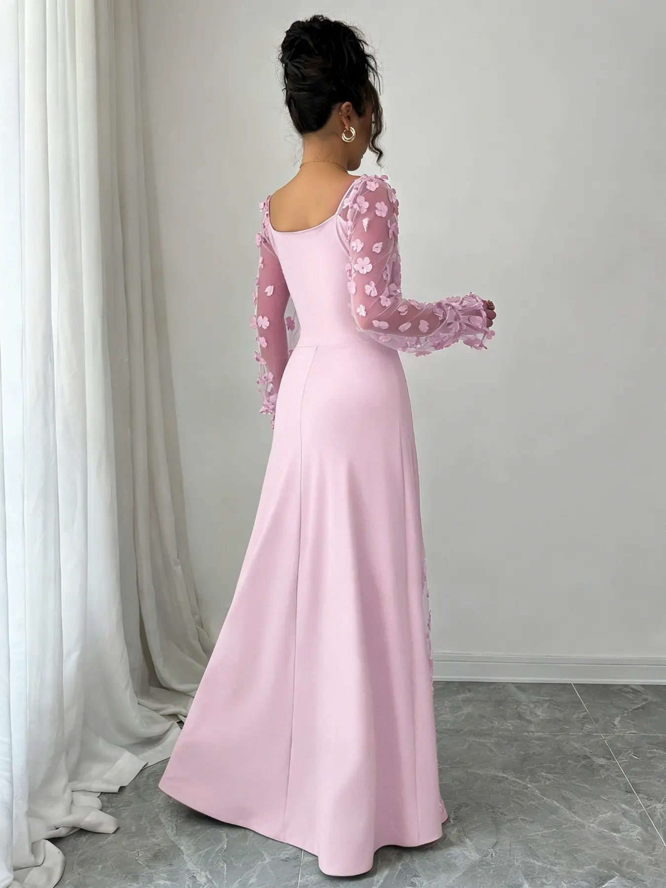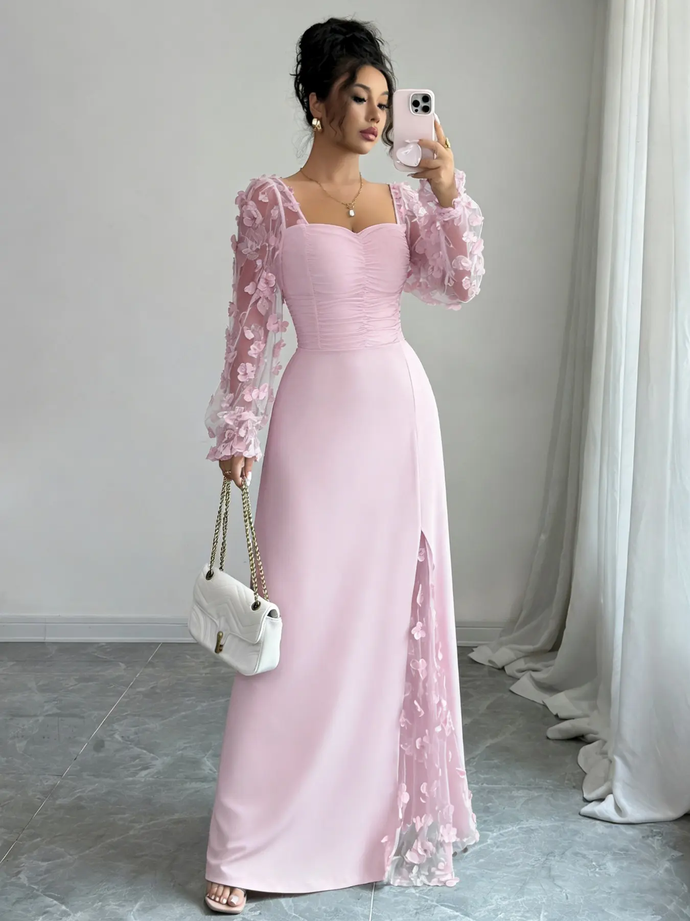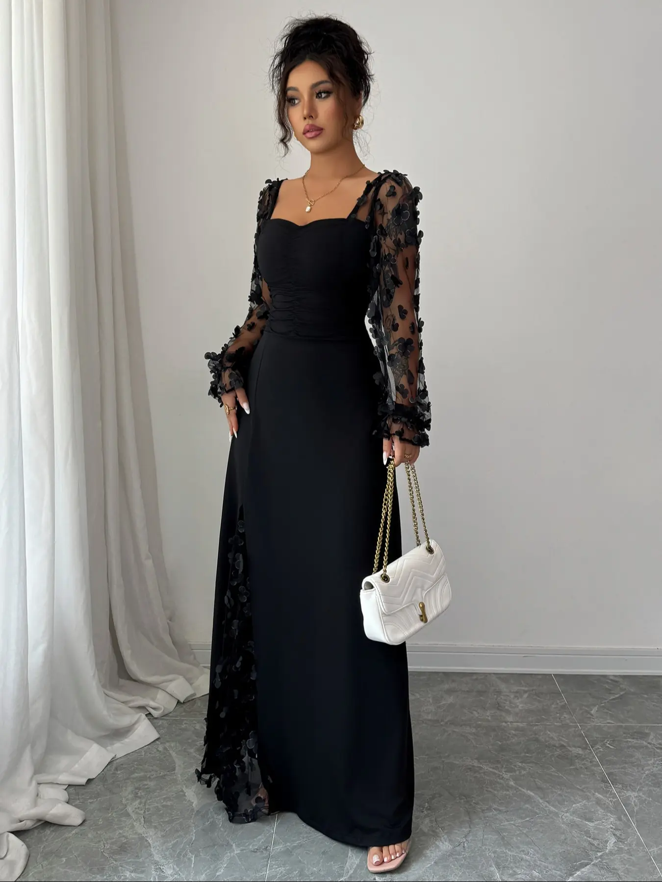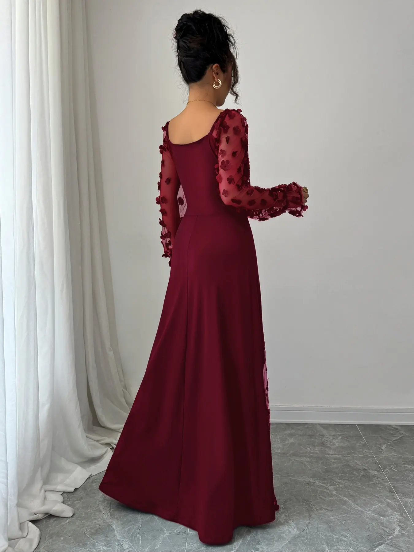 Vestido de malla con escote cuadrado, mangas largas, diseño dividido, estilo ajustado, ideal para ocasiones casuales y formales. #womenfashion #quincedresses #summerdress #flowerdress #momstyle #bridalfashion #quinceaneramakeup #fashionswear #redquincedress #quinceaneradresses