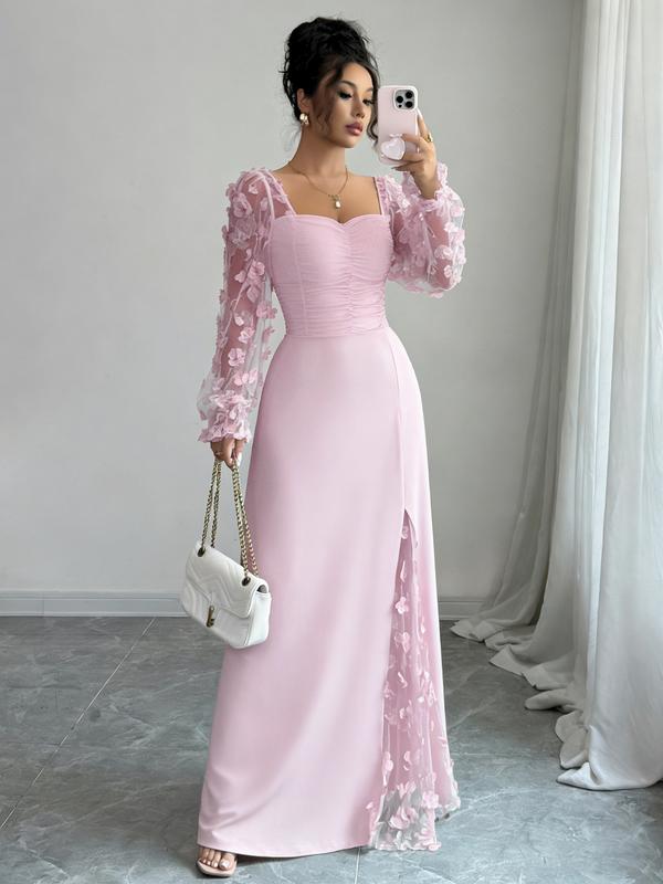 5. Pure Color Elegant Square Neck Mesh Long Sleeve Split Design Dress, Fitted Plain Style, Perfect for Casual and Formal Occasions