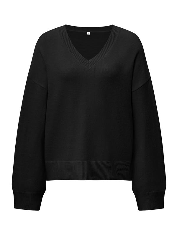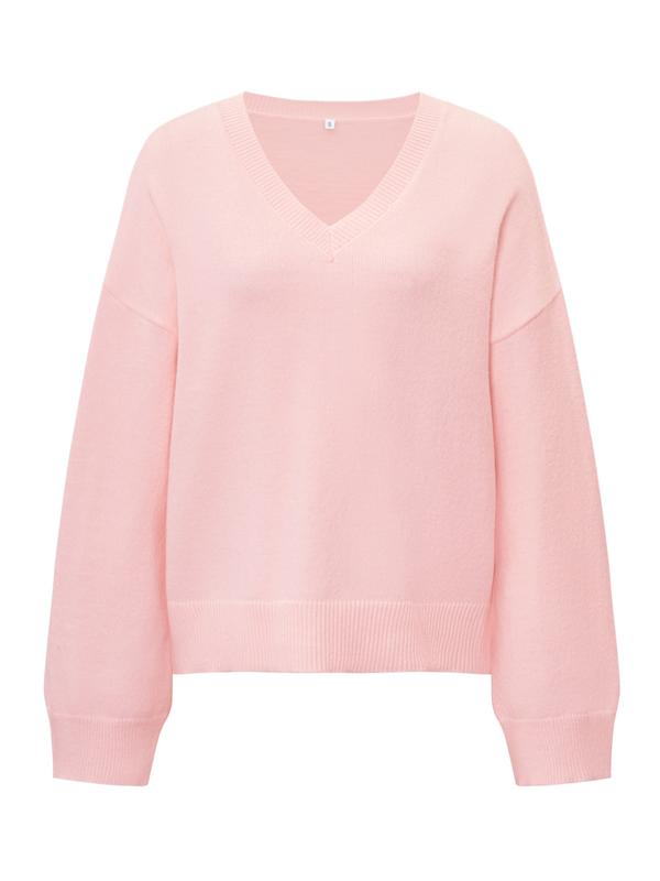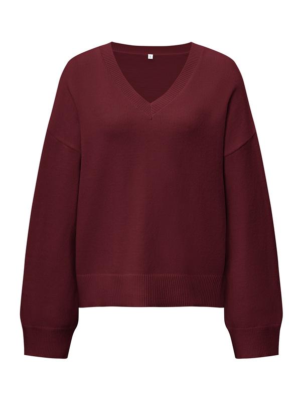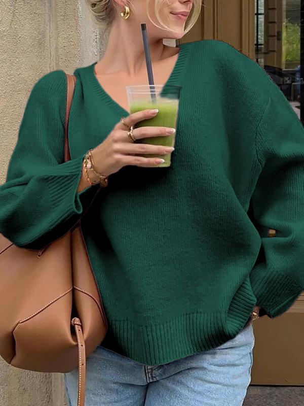 5. Pure Color Casual V-Neck Long Sleeve Loose Knit Sweater, Fitted Style for Fall, Comfortable and Stylish Women's Pullover