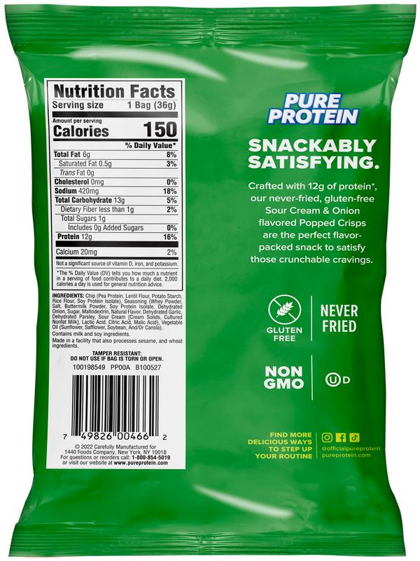 Take a bite of a protein snack that POPS! Pure Protein Sour Cream & Onion Popped Crisps are a new flavor-packed protein snack to satisfy those crunchable cravings. Crafted with 12g of protein, our Popped Crisps are big on flavor and crunch, yet never fried. They are gluten-free and non-GMO. So whether you’re snacking at home or on-the-go, grab a bag of Pure Protein Popped Crisps for a delicious, portable protein snack. Snackably satisfying! *See nutrition information for sodium content