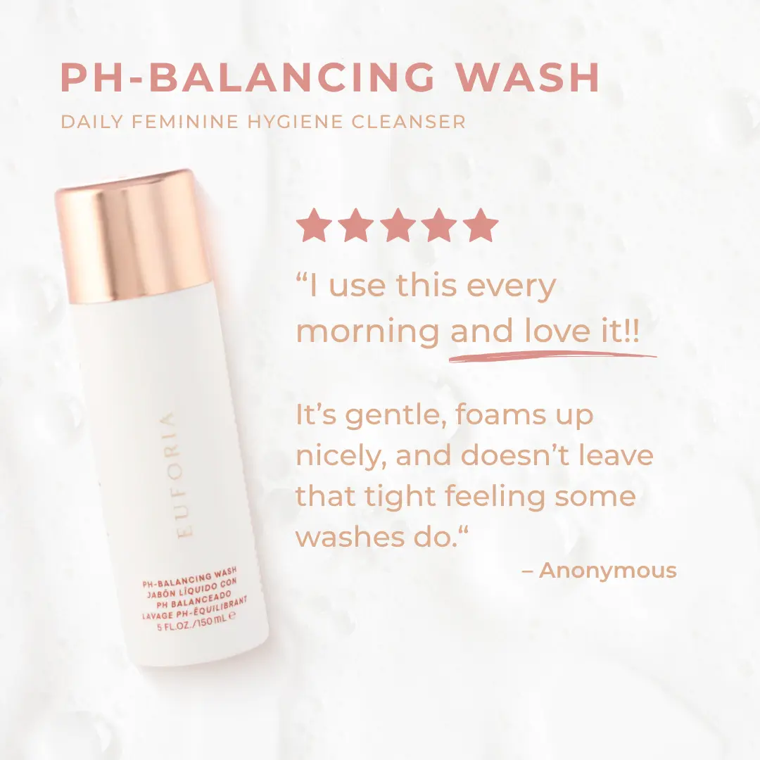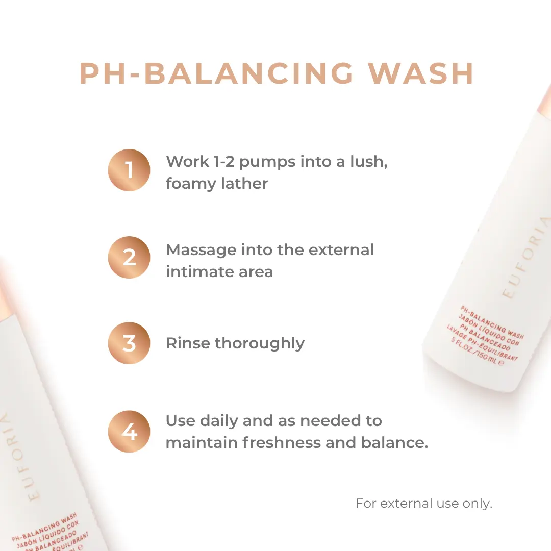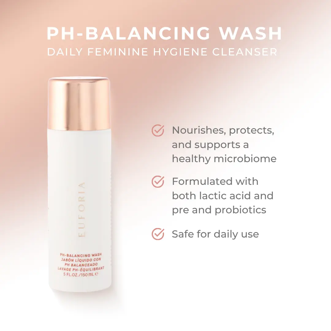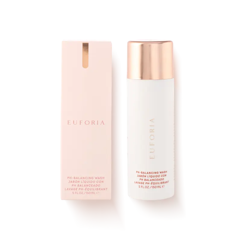 Euforia pH-Balancing Wash is a gentle, kind-to-skin cleanser enriched with nourishing ingredients. It's perfect for maintaining a healthy microbiome daily. Formulated with lactic acid and pre/probiotics, it ensures a healthy pH balance. It gently cleanses without stripping natural oils or moisture.