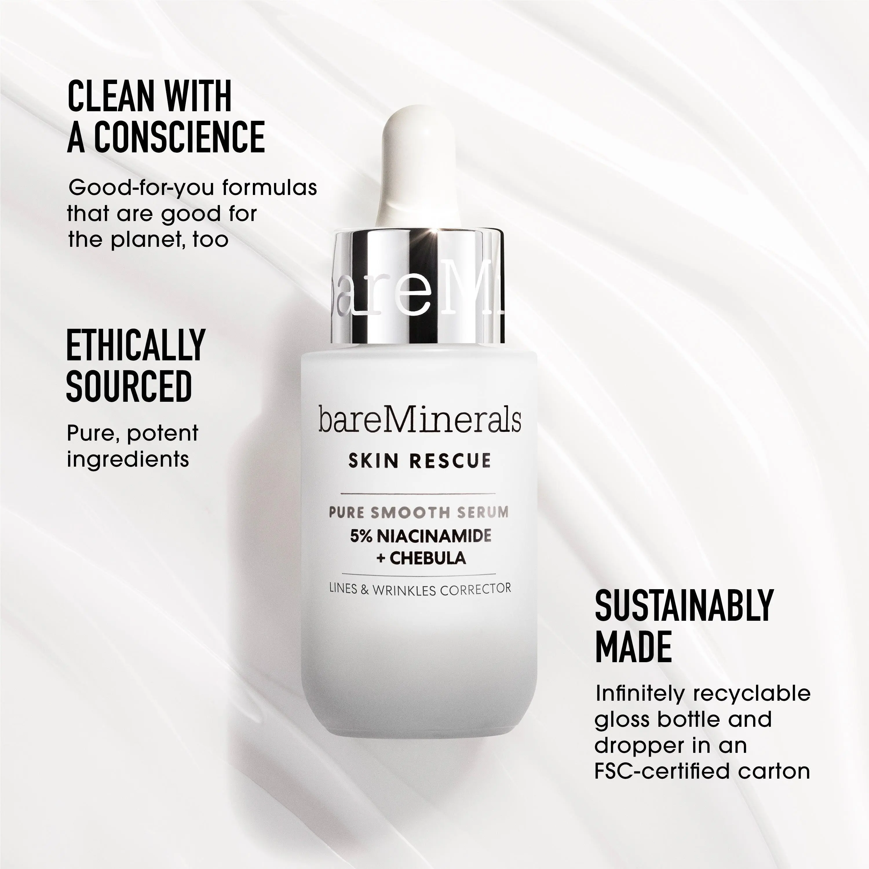 Backed by 10 years of research, Skin Rescue Pure Smooth Serum features a dual-patented sensitive skin base formula with 5% Niacinamide + Chebula actives to visibly improve skin texture and diminish the appearance of fine lines and wrinkles for smooth, rejuvenated youthful skin.