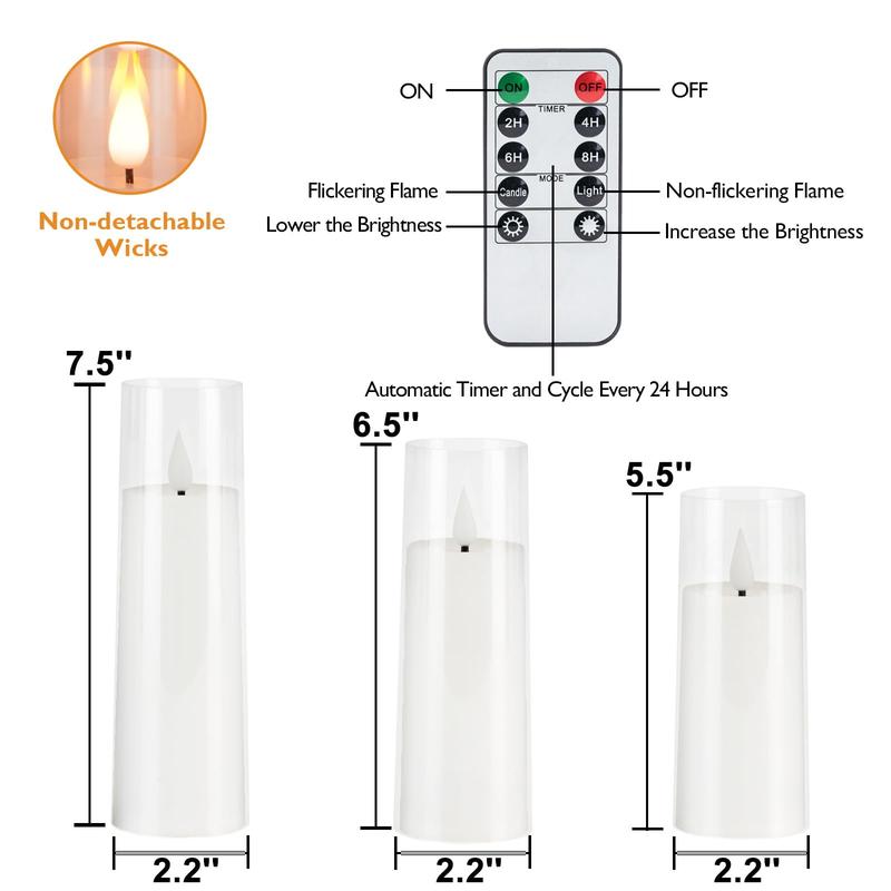 ·Remote Control & Timer Function: The smart 10-key remote control makes the operation more convenient and flexible: adjust the brightness, the light modes and set the timer freely within 50 feet. Set a 2H/4H/6H/8H timers will save your trouble to turn the electric candles on/off because they will come back on automatically at the same time every day