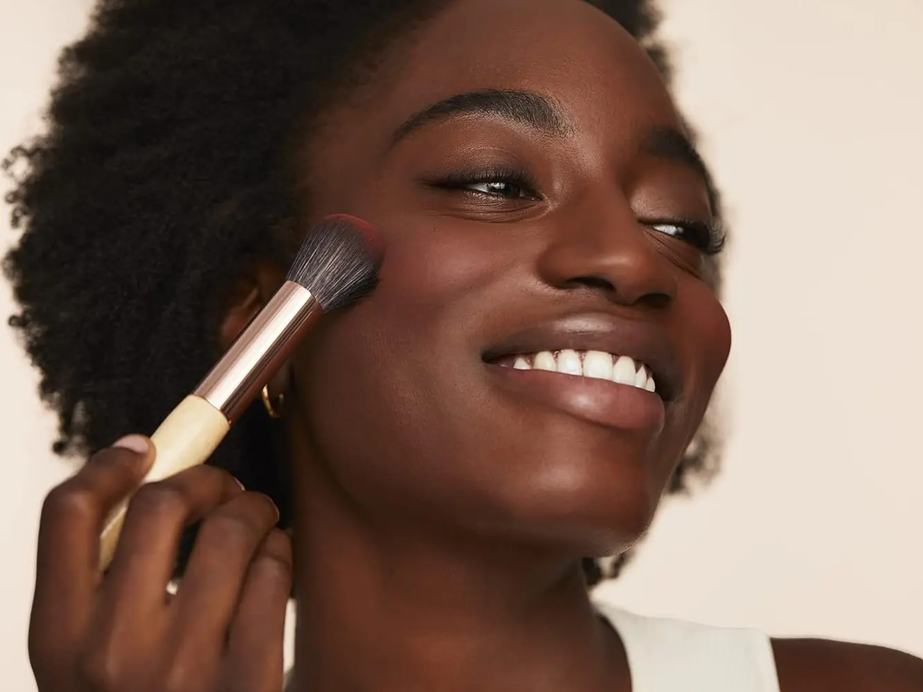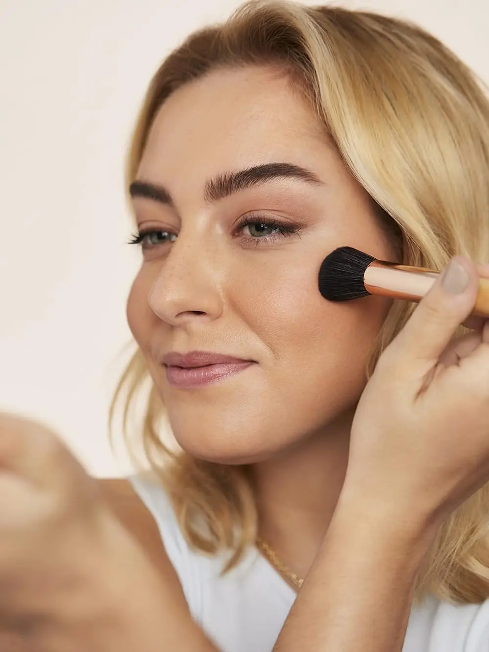 For a pop of color, apply with the Dome Brush to the apple of the cheek and blend in circles. To define and highlight cheekbones, apply with the White Fan Brush and blend upwards towards the temple for a natural glow.