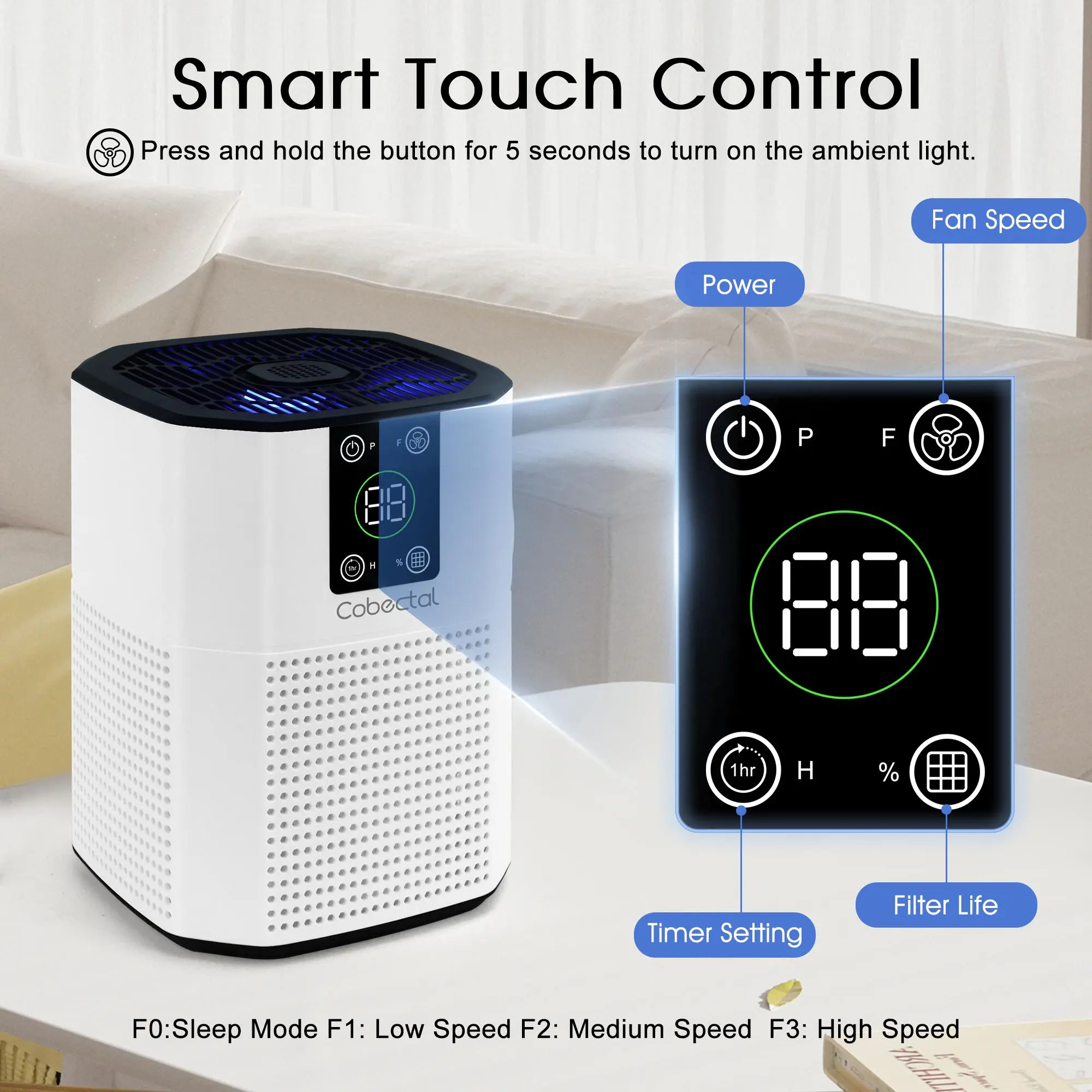 LIGHT MODE & FILTER REPLACEMENT REMINDER - Long press the fan speed button for more than 5 seconds, the ambient light of the air purifier lights up, illuminating the air purifier and decorating your bedroom desktop, long press the fan speed button again to make the ambient light go out.