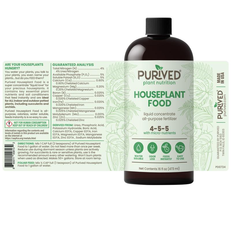 Elevate your indoor and outdoor plant care with Purived Houseplant Fertilizer, a super-concentrated all-purpose liquid plant food designed to help maintain greener foliage, beautiful blossoms, stronger stems, and a healthy root system.