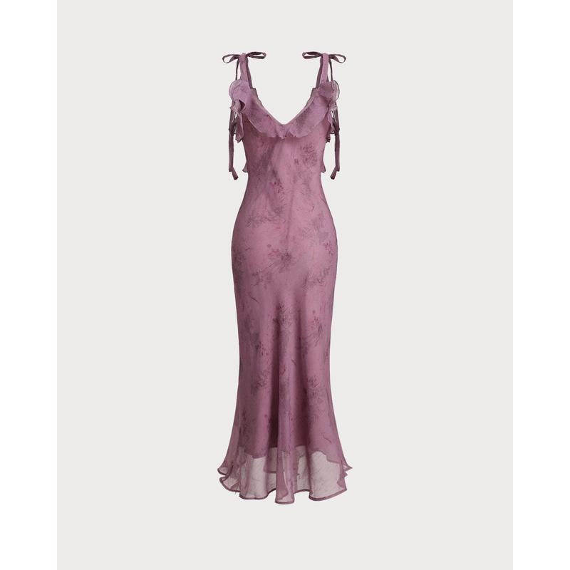 5. Purple Floral Ruffle Tie Strap Midi Dress