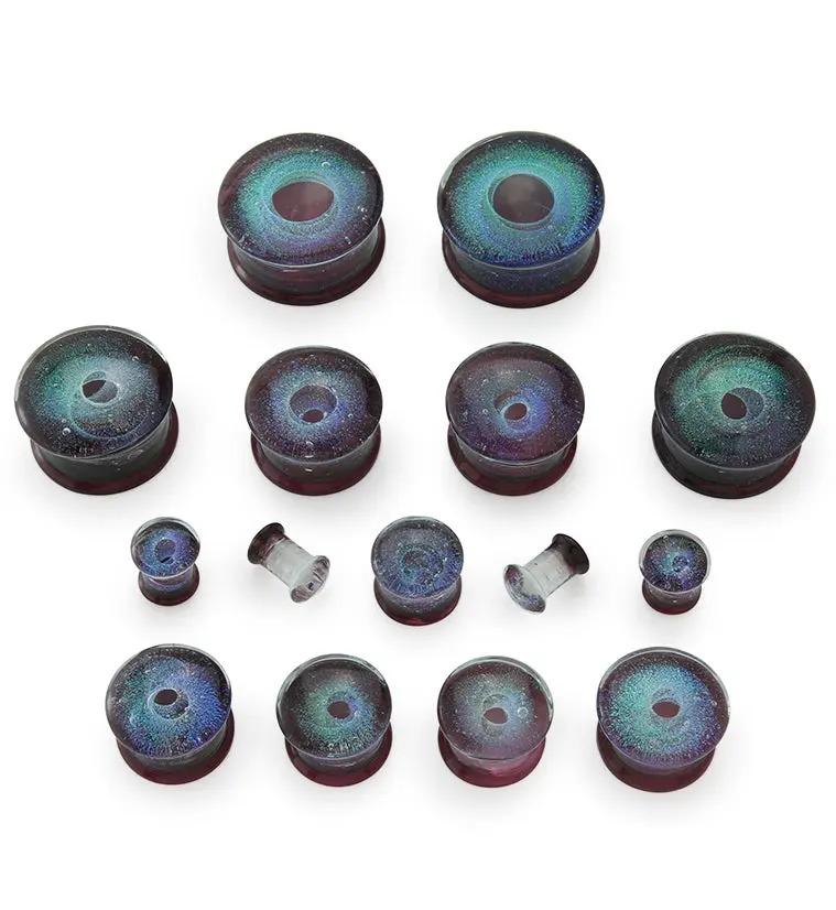 Dark purple glass plugs with a glittery green swirl in the center creating an eye look. Double flares. Handcrafted and polished. Pick your size from 2G (6mm) - 1" (25mm). Wearable area is 8mm. Full length (including convex dome front) is 12mm. Sold in pairs (2pcs).