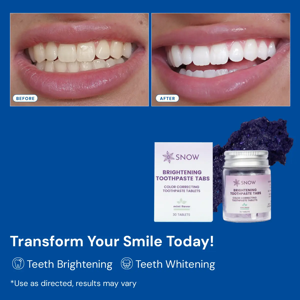 Take a ride on the foam cloud journey with SNOW Instant Teeth Brightening Toothpaste Tablets—the viral sensation that’s taking TikTok by storm! Expect a powerful punch with every use! Instantly brighten your smile with our innovative color-correcting purple tablets, designed to neutralize yellow stains and give you a temporary yet immediate smile lift.