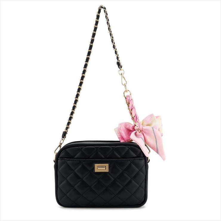 ·Design: The image shows a stylish purse chain extender with a bow ribbon, featuring a crossbody bag charm and keychain. The extender is designed for women and comes with an adjustable length for versatile use.