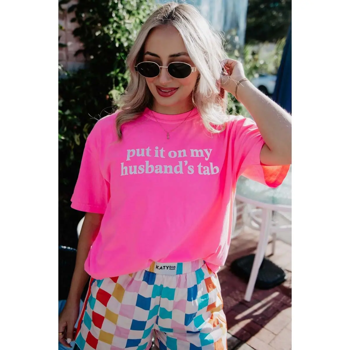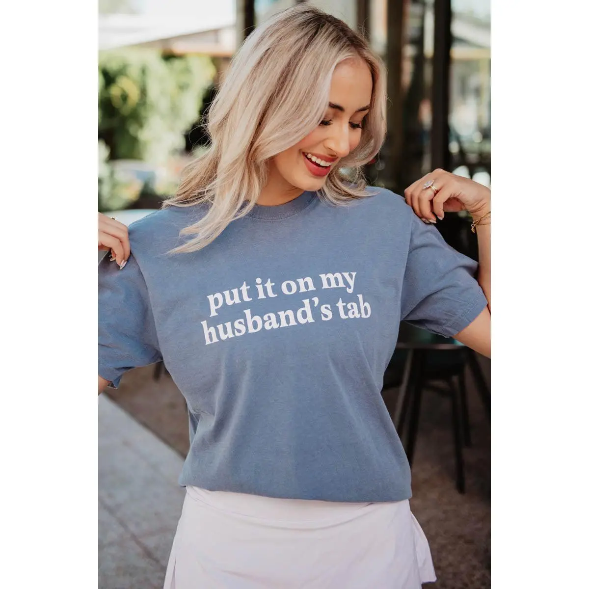 When in doubt, just blame it on him. This Put It On My Husband's Tab t-shirt is the perfect way to flex your “I’m not paying for this” energy. Whether you're out with your besties or grabbing drinks, this shirt says what we’re all thinking—he’s got it covered. Made from soft, breathable fabric, it’s perfect for casual hangouts, brunch, or when you just need to make a statement.