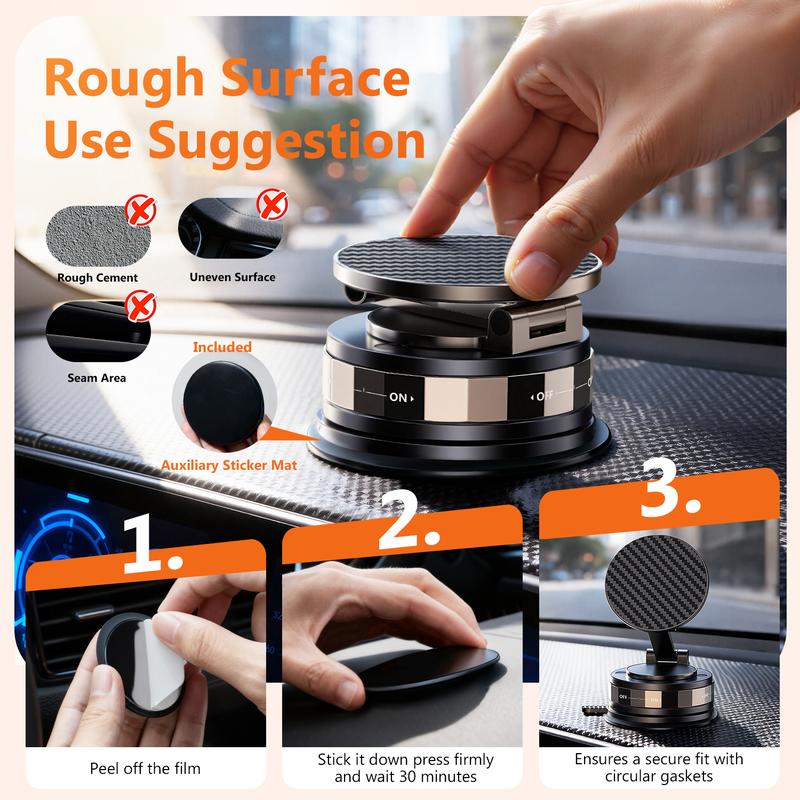 Surface Compatibility Notice – For textured, uneven, or curved dashboards, use the included round PC pad as a backing surface. For non-MagSafe phones or thicker cases, apply the included magnetic ring to ensure optimal magnetic ring attachment.