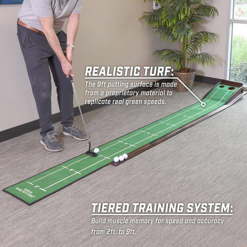 The Pure Putt Golf 9 ft Putting Ramp is a game changing training aid that is proven to improve players' putting. The 9 ft putting surface is engineered to roll like a typical putting green with options to putt to a small or medium size cup depending on your desired level of difficulty. The putting surface includes set positions ranging from 2 feet to 9 feet so you can build muscle memory for varying putt lengths. The guides at each putting position help ensure correct alignment and accuracy. The ramp is crafted using premium stained wood with a timeless design to look great for any home or office. Complete set includes: 9 ft putting surface with 2 cup sizes and automatic ball return, and 4 golf balls. Take your short game to the next level today with GoSports Pure Putt Golf 9 ft Putting Ramp!