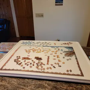 I LOVE having a safe spot to put puzzles together. I also love that it is mobile... I can move it wherever I want to work on it. The first Pic shows how I used to protect the puzzle. Now, I don't have to worry abt losing pieces... Welll at least not to my cat!! Only wish it was a bit bigger.
