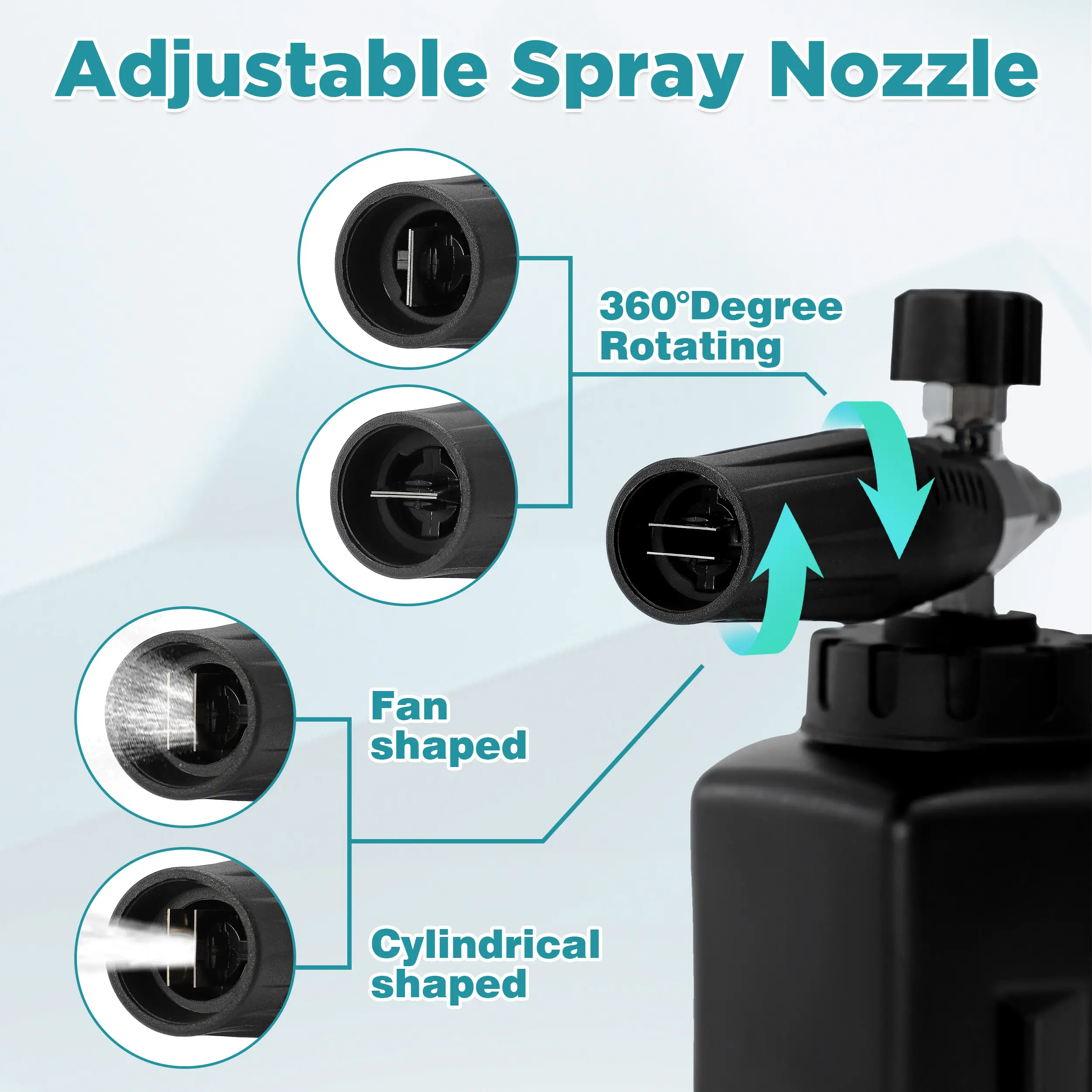 ·ADJUSTABLE FOAM SPRAYER - The heavy-duty foam core of the high pressure washer foam cannon produces a snowy foam that hugs the surface of your car. Easily remove dirt and grime from your car. The foam cannon adjustable nozzle ensures an ideal spray pattern and the water volume adjustment knob controls the mix of water and foam for professional-grade cleaning results, reducing the time and effort required for cleaning.