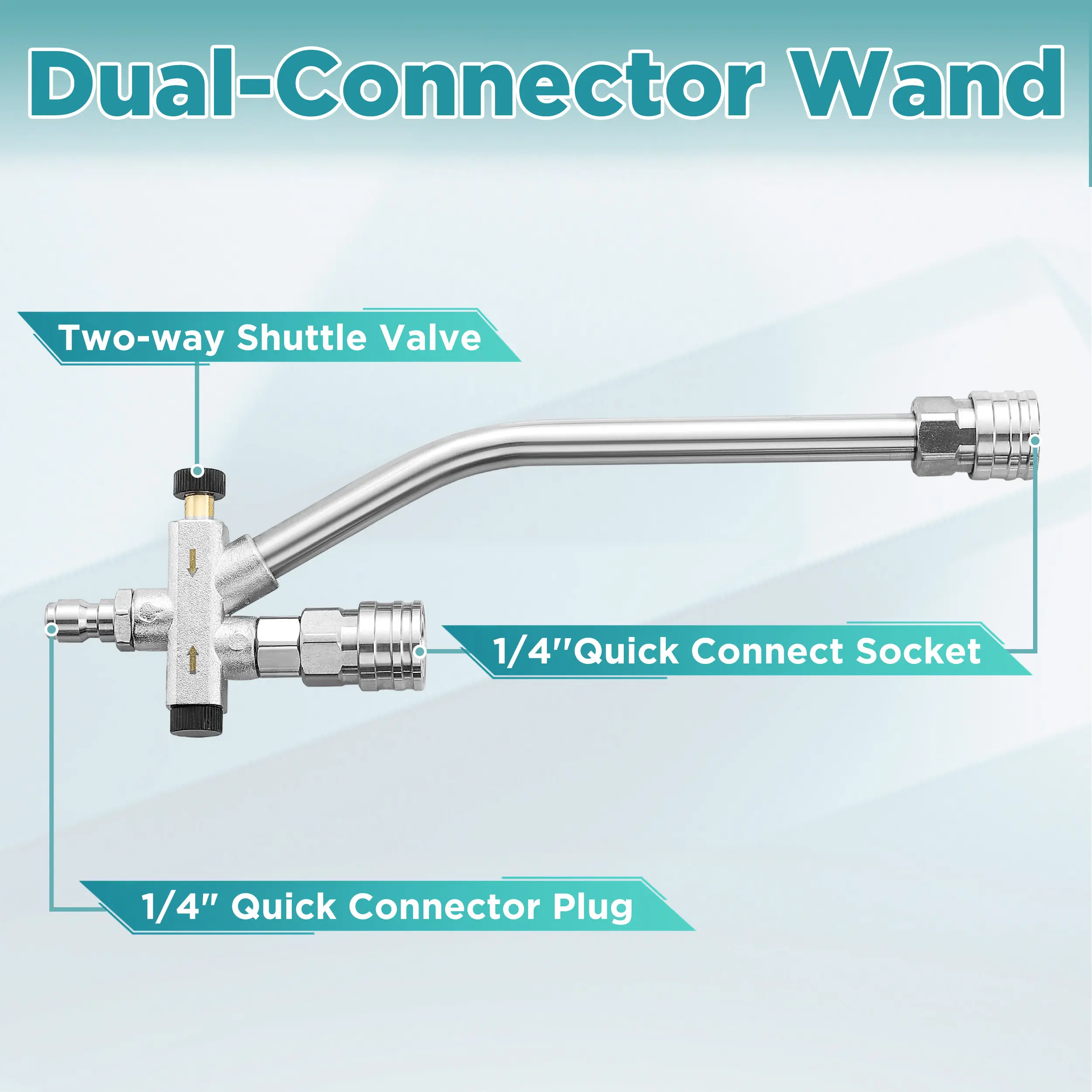 ·DUAL FITTING ATTACHMENT - The dual nozzle attachment for high pressure cleaning foam cannon has a two-way shuttle valve, which can be connected to the foam cannon and high pressure nozzle at the same time.There is no need to switch back and forth between the tools used for cleaning, you only need to adjust the valves to realize the switch between spraying foam and clean water.