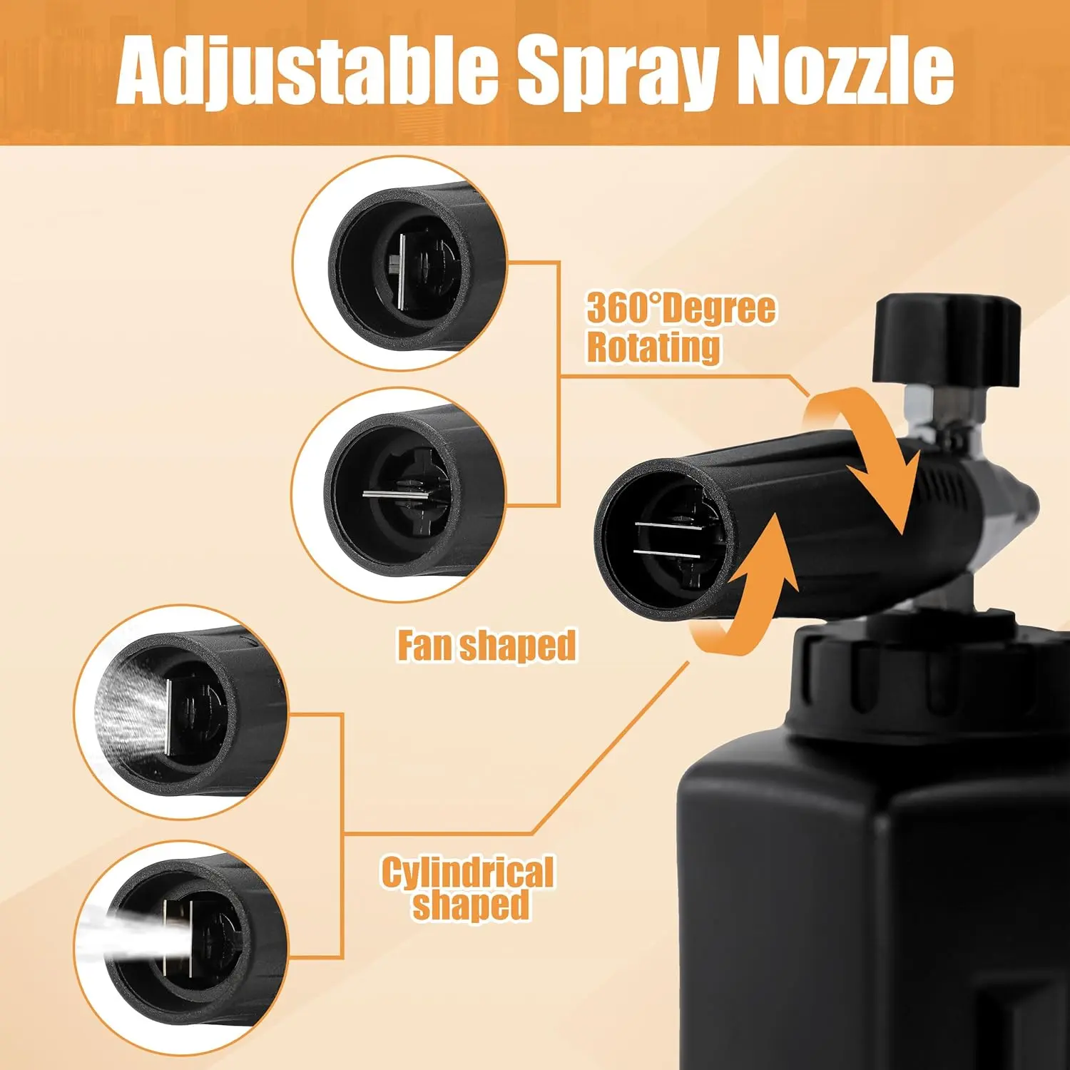 ·ADJUSTABLE FOAM SPRAYER - The adjustable nozzle ensures the ideal spray pattern, while the water regulator knob controls water and foam mix. The nozzle holder rotates 360 degrees to tweak the direction. Snow foam cannon makes car washing faster, reducing the amount of time and effort required for cleaning.