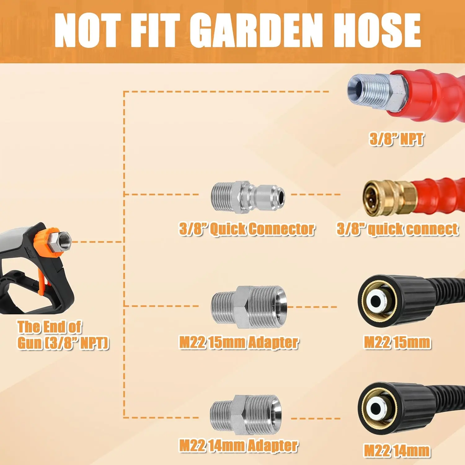·GREAT COMPATIBILITY - The universal power washer foam gun is compatible with a 3/8" NPT adapter, additionally equipped with three types of connectors: M22-14mm, M22-15mm fittings, and 3/8" quick connector. They are available for different sizes of pressure washer hoses, compatible with most high-pressure washer models.