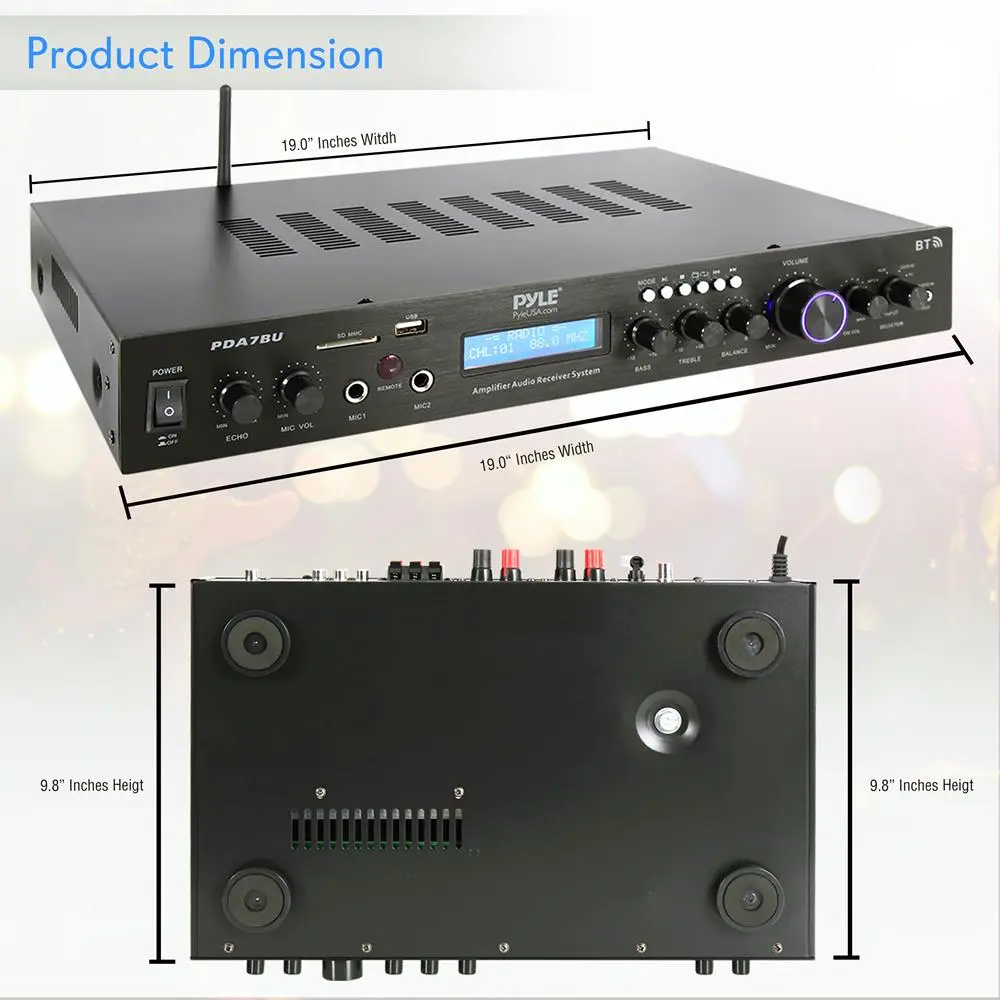 The Pyle Home Theater Amplifier Audio Receiver Sound System with Bluetooth Wireless Streaming, MP3/USB/SD/AUX/FM Radio (200 Watt) - Rack Mount Amplifier Receiver - 2.1 Channel Audio Amp Design - Bluetooth Wireless Audio Streaming Ability - USB Flash & SD Memory Card Readers - FM Radio with Digital LCD Display - ID3 Tag Readout Displays Song Title - Aux (3.5mm) Input Jack - Connect & Stream Audio from External Devices - Multi-Source RCA (L/R) Audio Input Connectors - (2) 1/4’’ Microphone Inputs - Spring-Loaded Speaker Terminals - Combo Screw-Type Banana Plug Speaker Jacks - RCA Subwoofer Output - Front Panel Button Control Center - Independent Input Source Selectable.