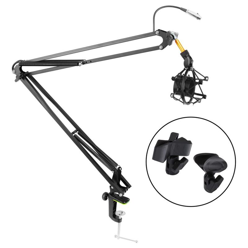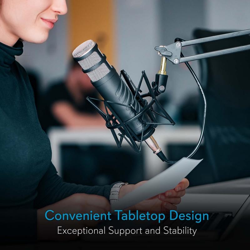 The Pyle Suspension Scissor Microphone Stand Pro provides quick and convenient mic placement. Adjustable boom stand and extending arms keep your mic in place via suspension springs for optimal audio performance. Whether used for radio broadcasting, recording or streaming -- you will enjoy quick setup and reliable microphone placement. Additional mount features include integrated XLR connection cable with internal cable routing, microphone shock mount and USA standard adapter threading, all designed for hands-free audio & vocal recording. The clamp-style locking support base provides versatile mounting ability for microphone attachment over any table, counter or computer desktop. Enjoy convenient audio control and position your mic exactly where needed with the Pyle Stage & Studio Desk Suspension Boom Microphone Mount (microphone not included).