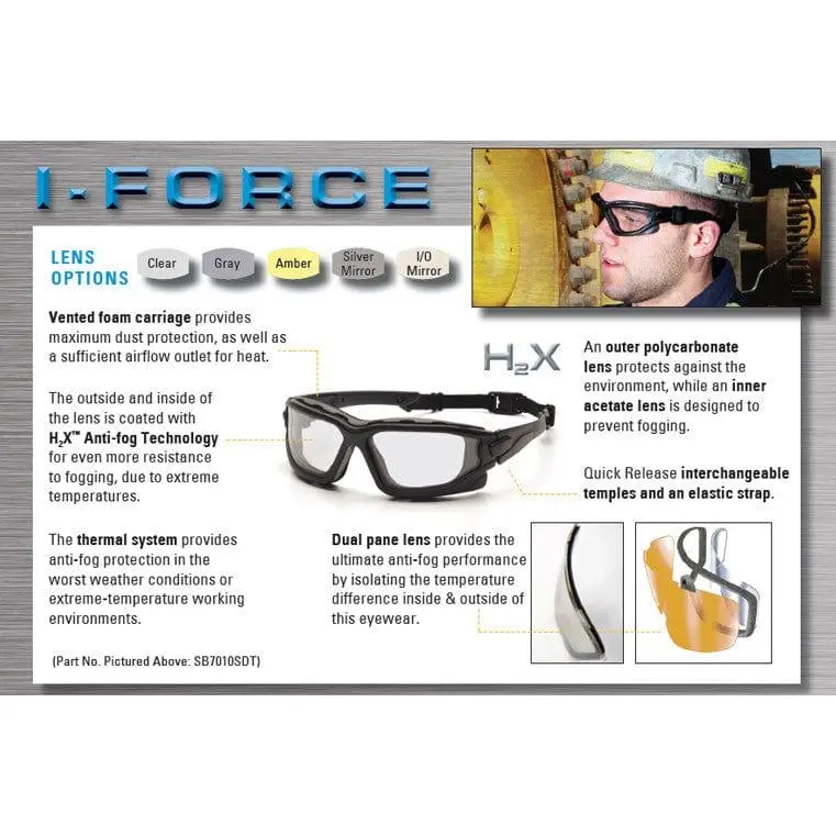 The Pyramex I-Force is coated on both the inside and outside with Pyramex's patented H2X anti-fog coating to resist fogging even in extreme temperatures. The quick-release interchangeable temples and strap eliminate the need for a bulky goggle and standard pair of safety glasses, allowing the wearer to adapt effortlessly to changing tasks. Maximum dust protection is provided by the indirect-vented foam carriage, which permits adequate airflow. Feel confident performing any task with the Pyramex I-Force Convertible Safety Glasses/Goggle.