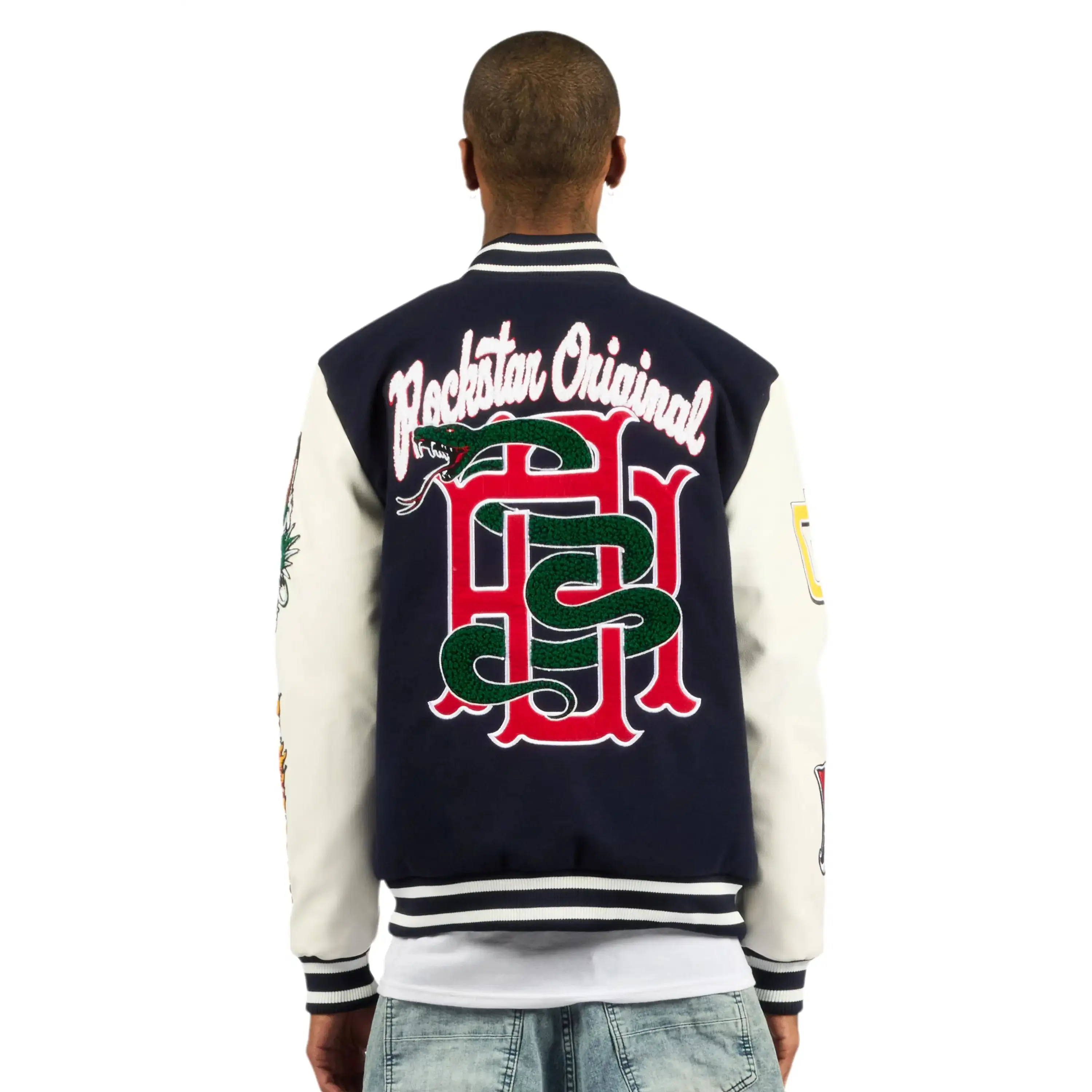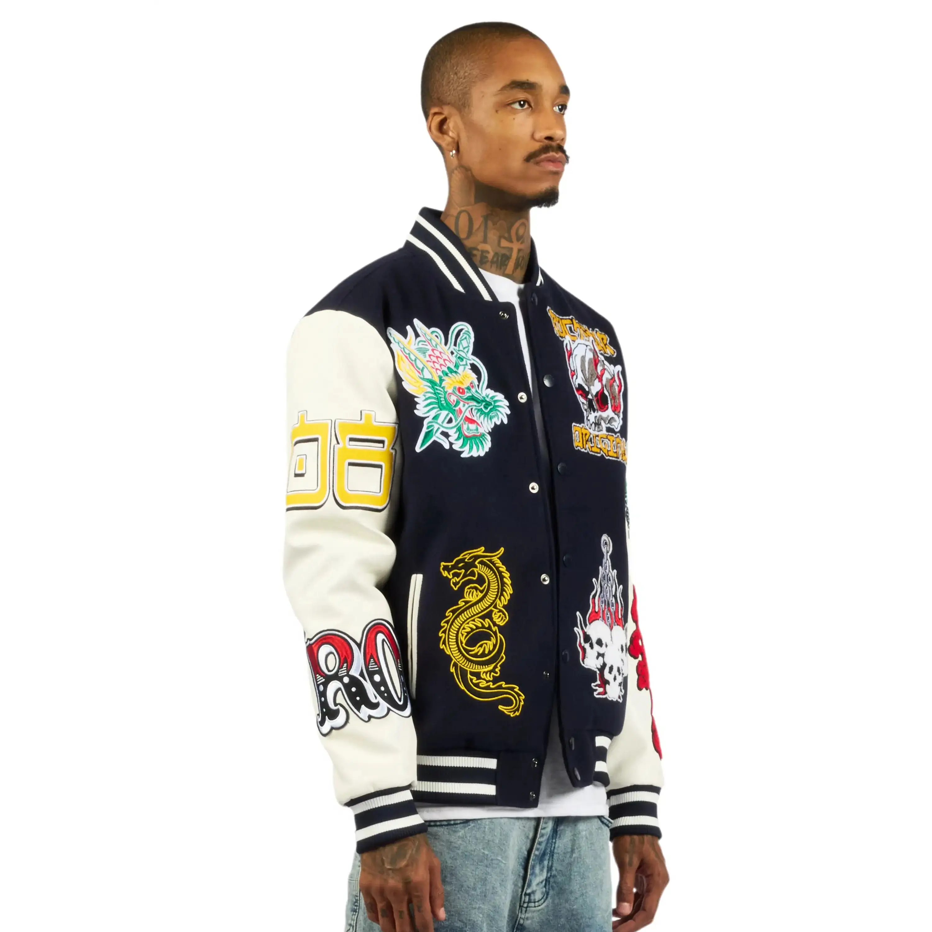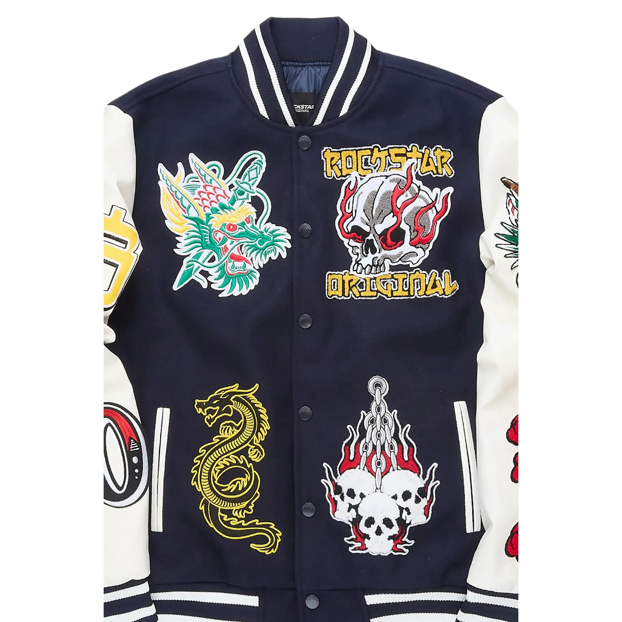 An urban collegiate varsity jacket for men in navy. Designed with an ultra soft fleece body and contrast faux leather sleeves for a dope outerwear style.