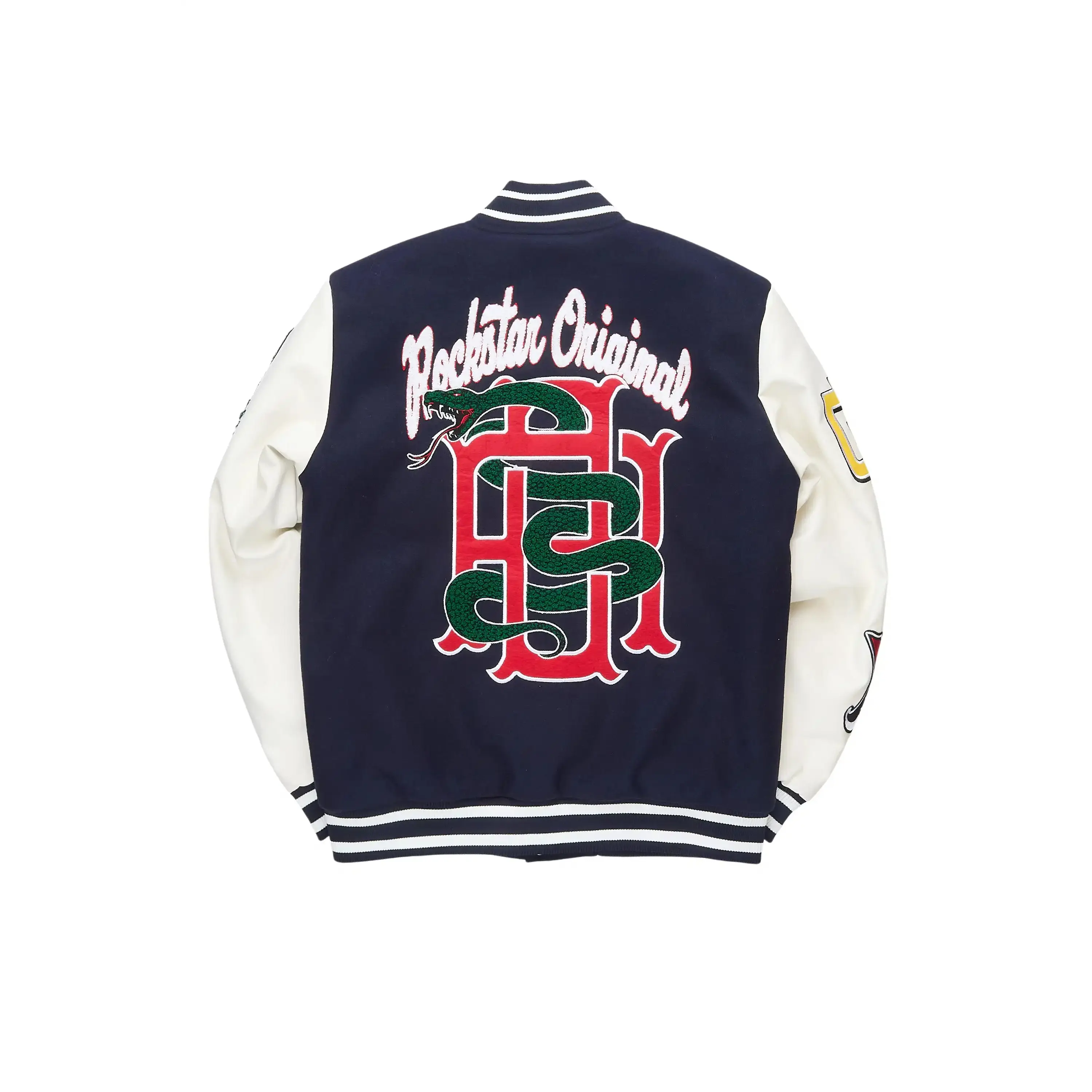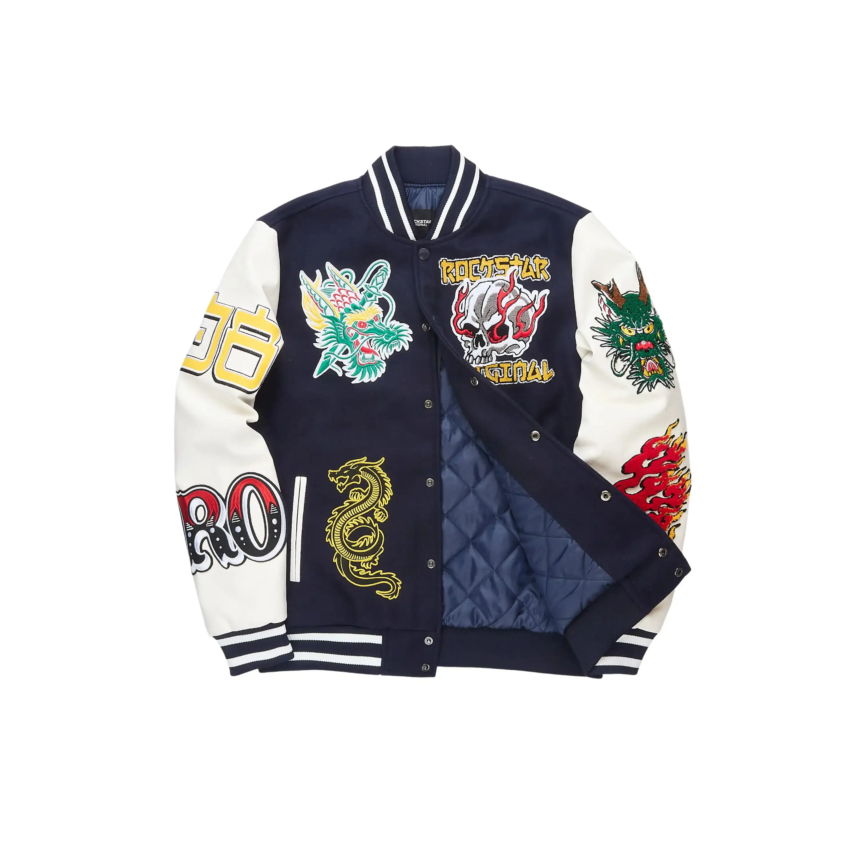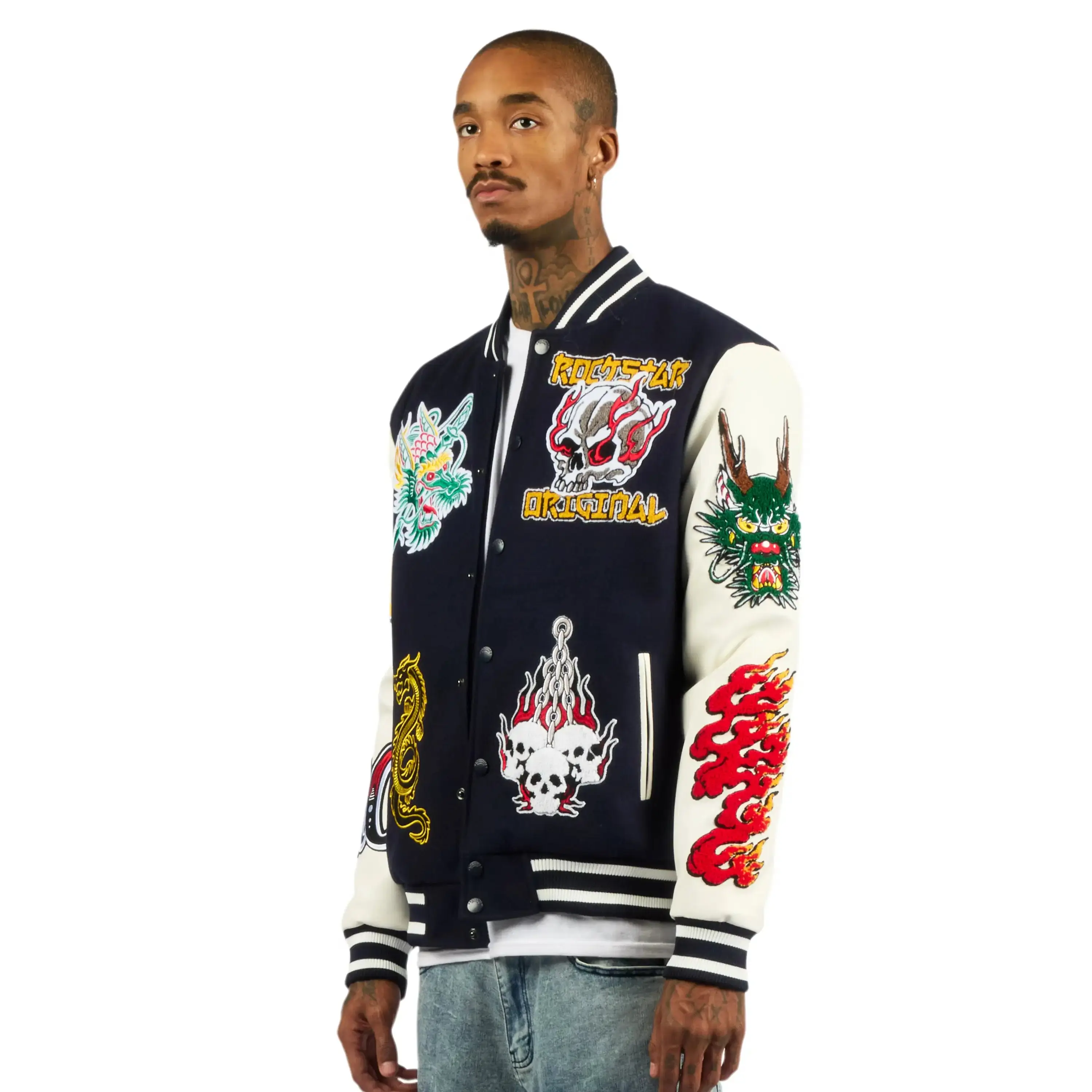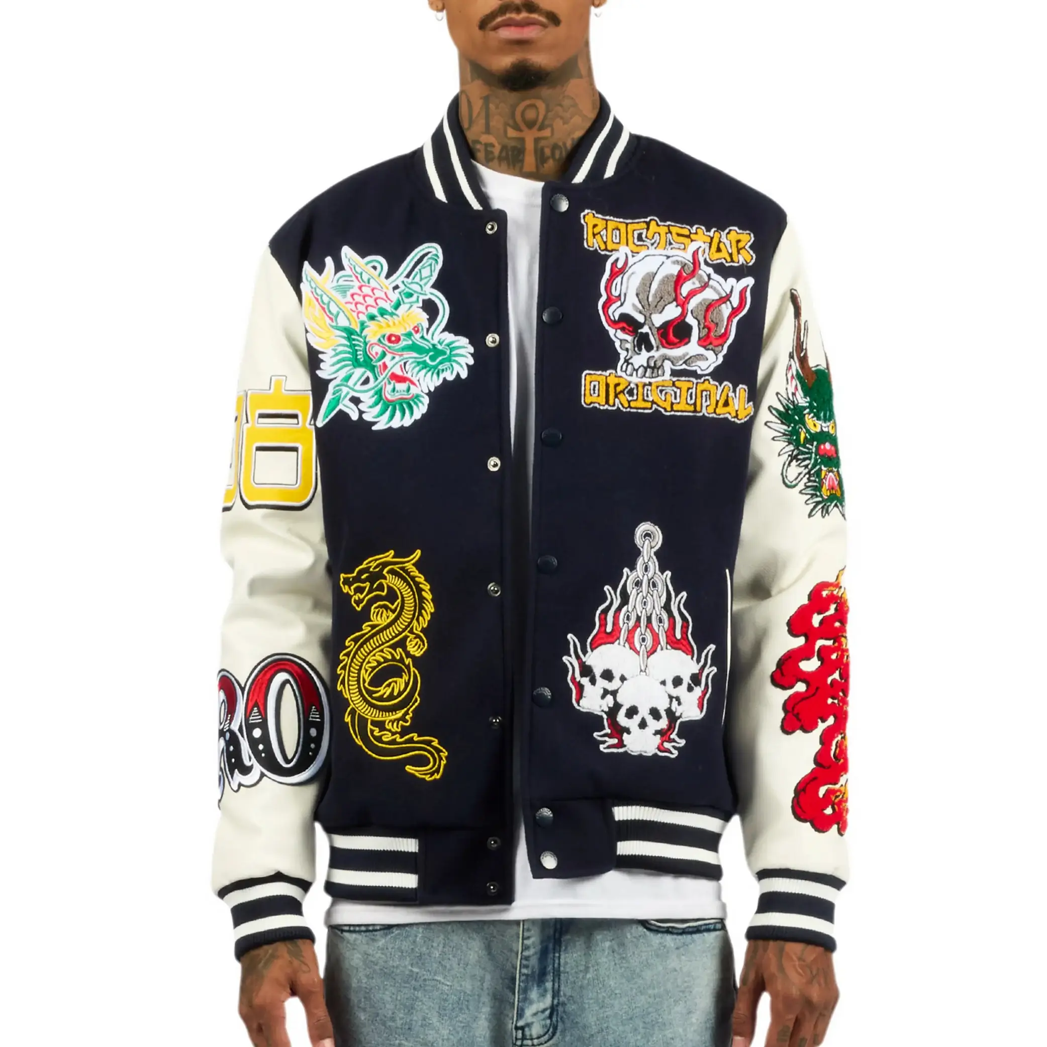 An urban collegiate varsity jacket for men in navy. Designed with an ultra soft fleece body and contrast faux leather sleeves for a dope outerwear style.
