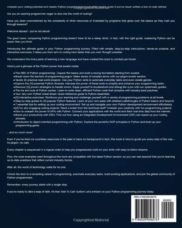 Introducing the ultimate guide in your Python programming journey. Filled with simple, step-by-step instructions, hands-on projects, and interactive exercises, it takes you from zero to coding hero faster than you ever thought possible.
