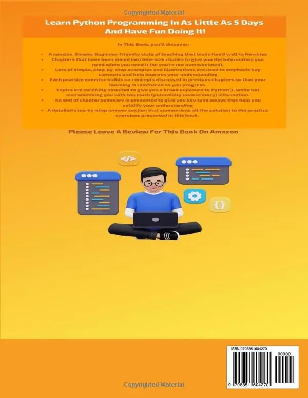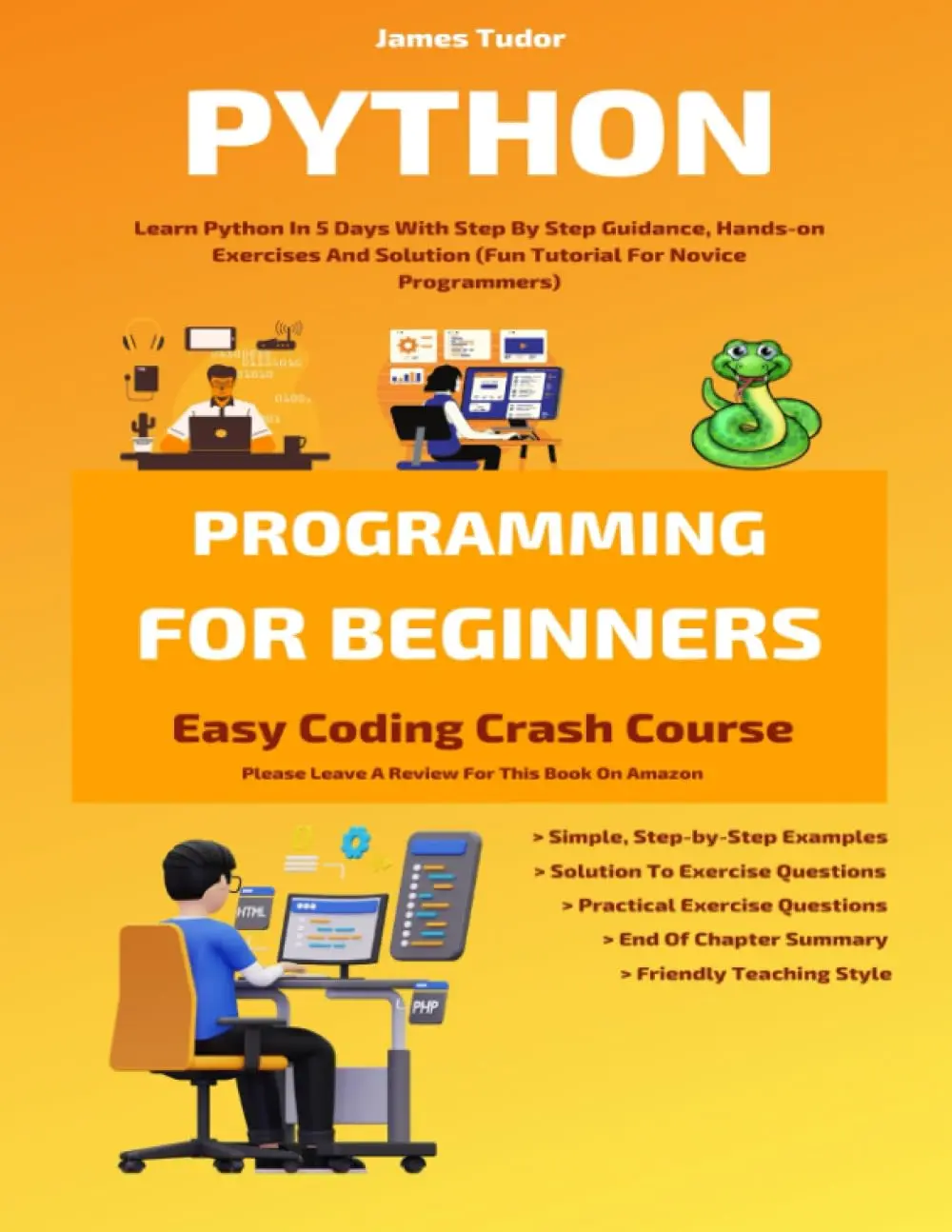 5 times #1 Amazon bestselling author, James Tudor, provides a concise, step-by-step guide to Python programming for beginners. A lot of examples, illustrations, end-of-chapter summaries, and practice exercises (with solutions) are provided to help the reader learn faster, remember longer, and develop a thorough understanding of key concepts.