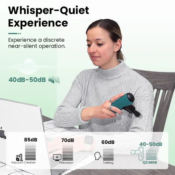 Deep Tissue Massage and Powerful Pain Relief: The Q2 Mini features 5 adjustable speeds (1800, 2100, 2400, 2700, 3000 RPM) and a 7mm amplitude, delivering deep tissue therapy to break up knots, relax tight muscles, and provide effective pain relief. Each speed offers tailored therapeutic benefits for different muscle groups. With 5 interchangeable massage heads, it precisely targets hard-to-reach areas, ensuring a customized massage experience for pain relief and recovery.