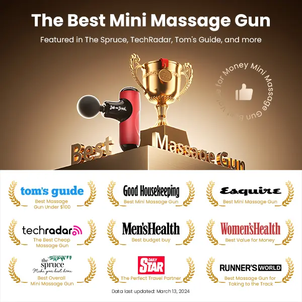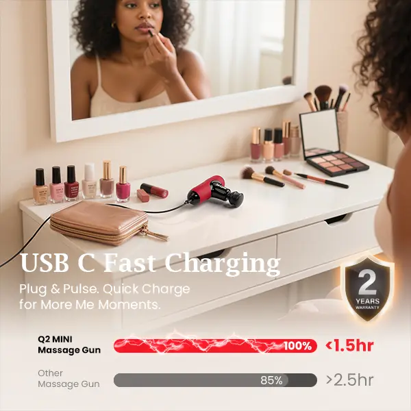 5 adjustable speeds (1800, 2100, 2400, 2700, 3000) percussions per minute, each speed delivers greater therapeutic benefits for the body. Q2 MINI is the perfect massage gun for athletes and it's the size of a bottled water (5.7”L x 3.4”W x 1.8”H). Weighing in 0.95lb, tuck this tiny, tote-able workout partner into your carry-on, purse, or backpack.