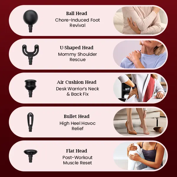 5 massage head target different muscle groups. After an injury or workout, your body repairs itself - but slowly. Q2 MINI intense vibrations provide immediate pain relief, and wake up muscles throughout your body, triggering a myofascial release and enhancing your body’s ability to regenerate cells and repair itself.