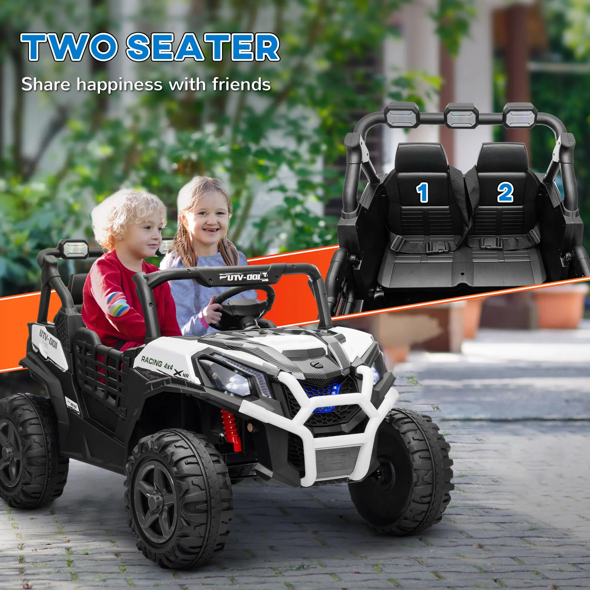 ·Spacious two-seater allows two kids to share the driving fun;