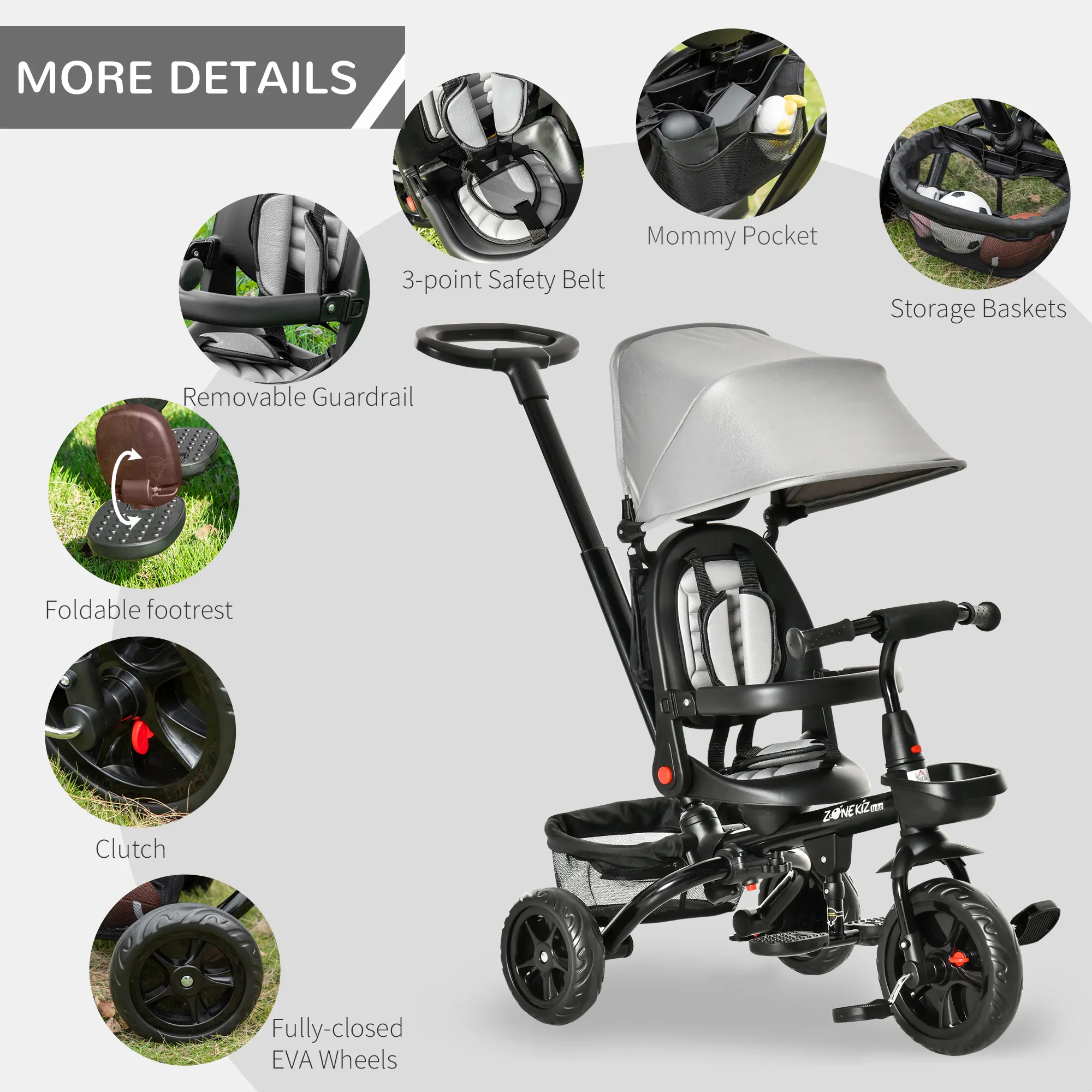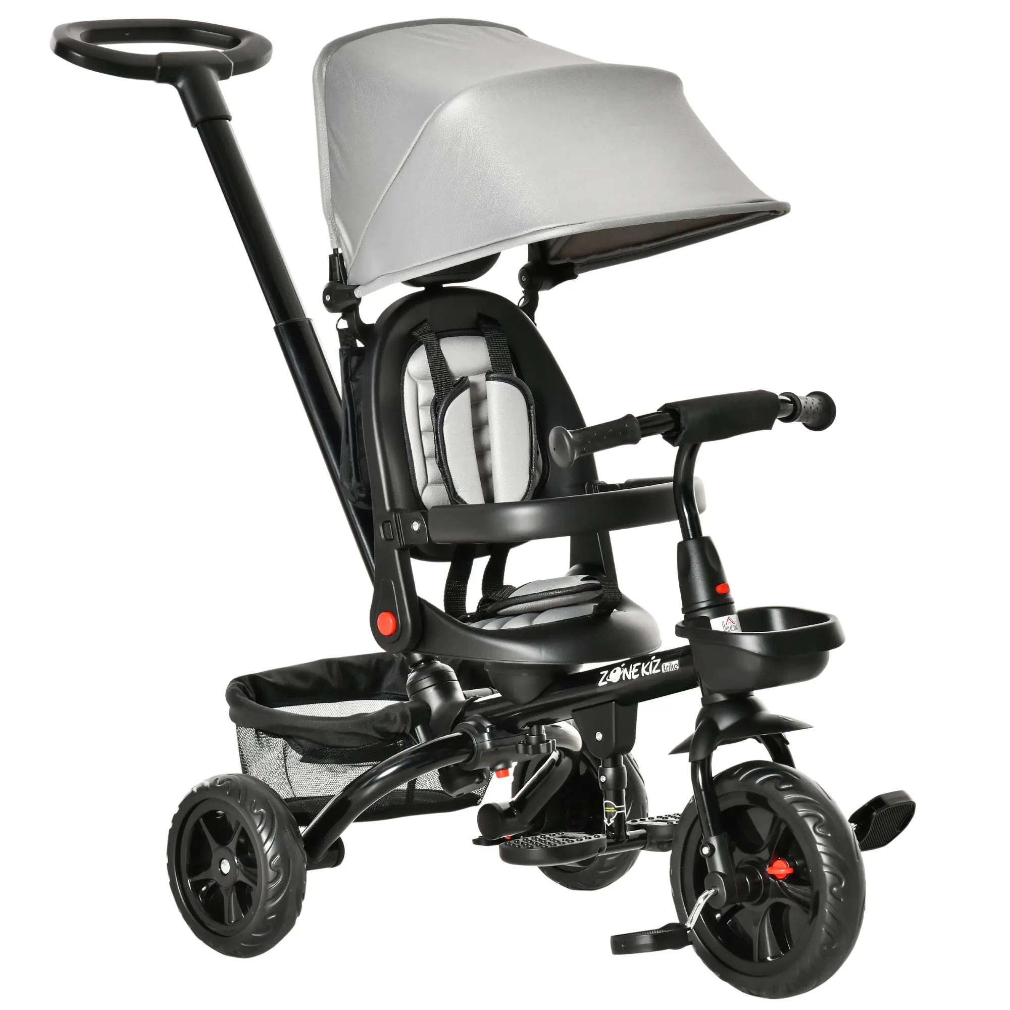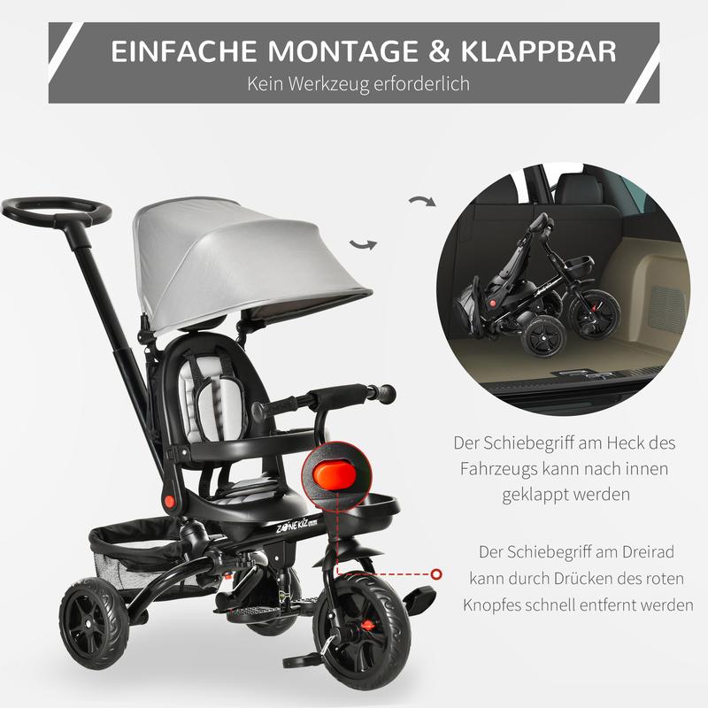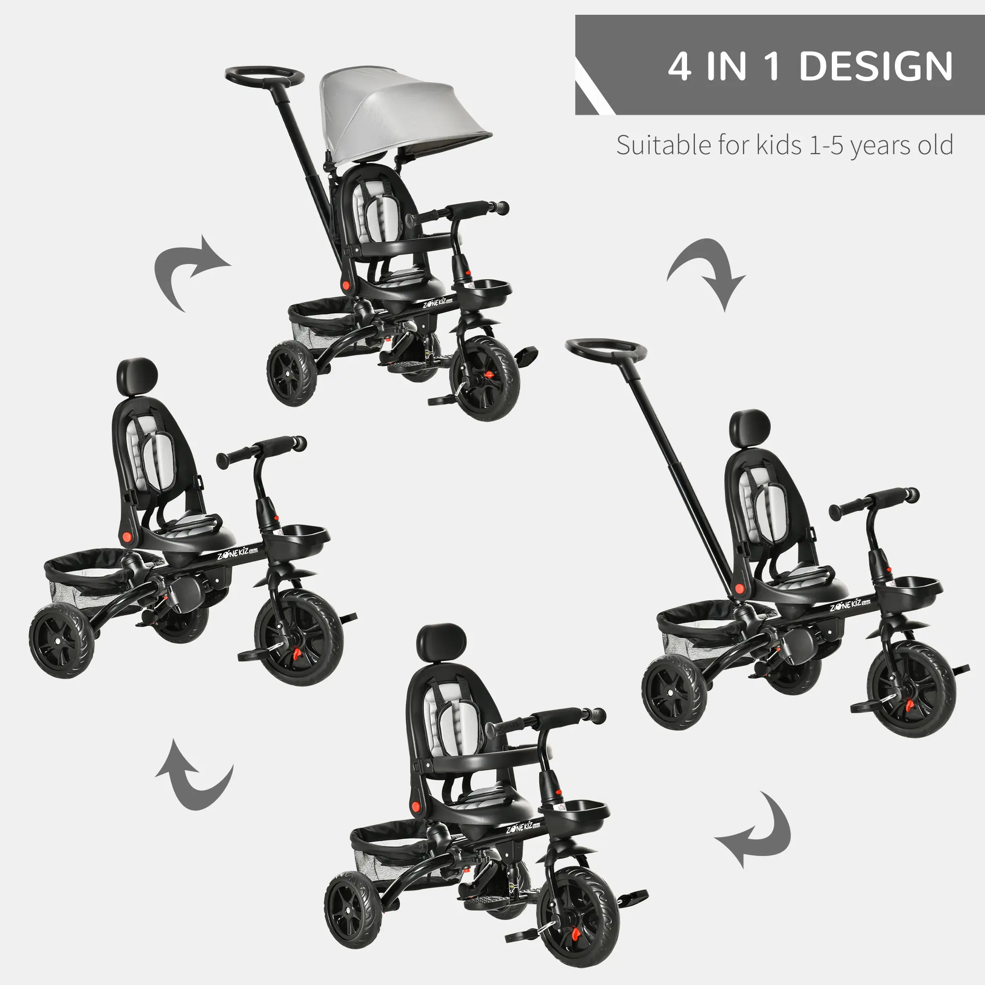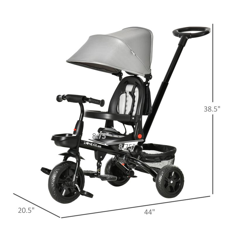 ● 4 in 1 kids tricycle with detachable push handle, backrest, footrest;
