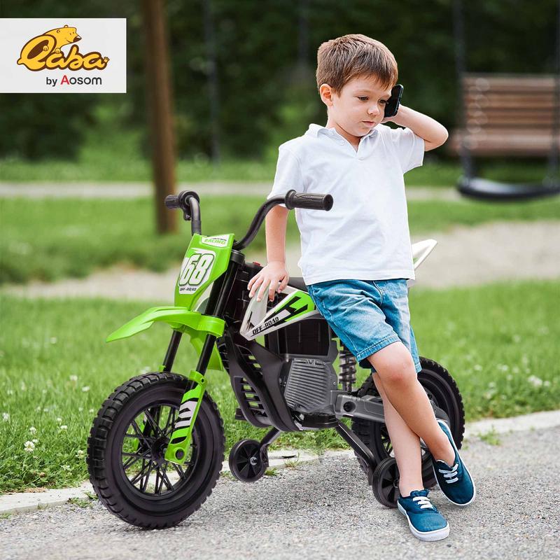 Rev up the fun with the Qaba kid's motorcycle bike. Featuring manual throttle control for speeds between 1.5-3.1 mph and powerful dual 12V motors, this electric motorcycle for kids offers a thrilling ride. Kids can enjoy built-in music and a power indicator for an immersive experience, complete with training wheels to keep the little riders balanced and safe across any adventure.
