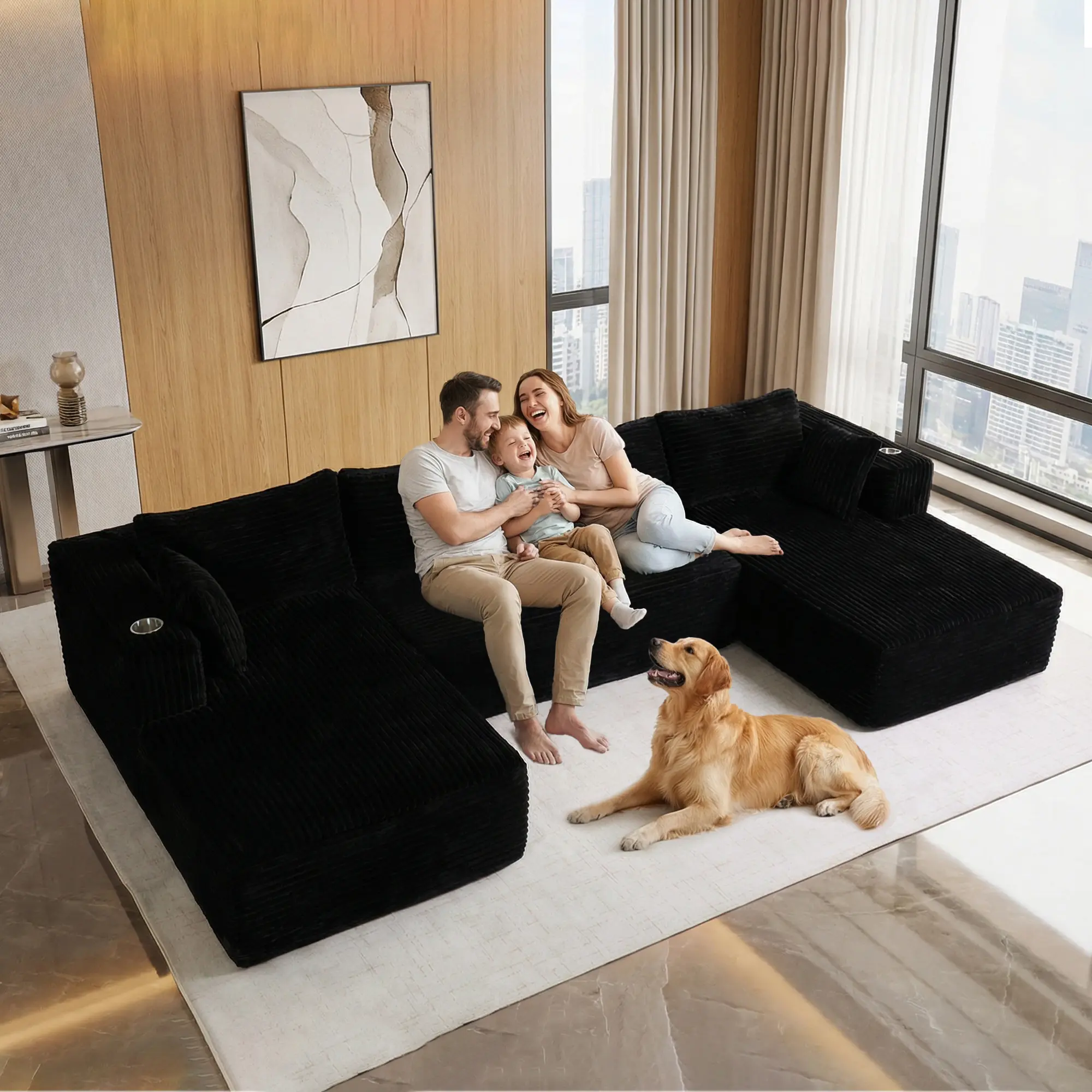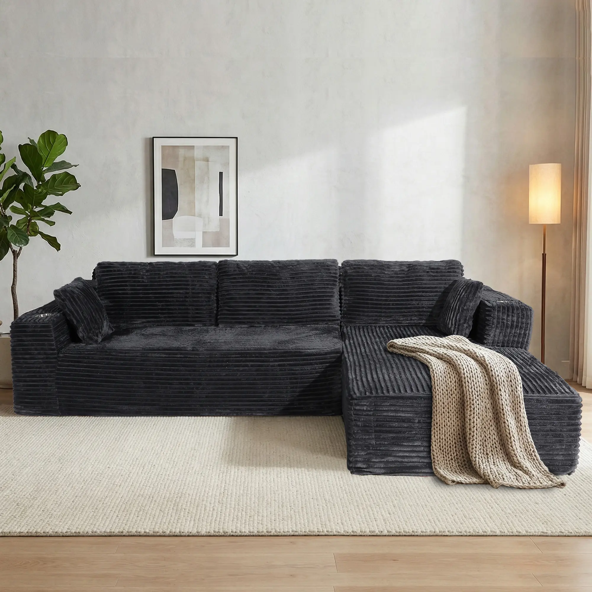 This U-shaped chaise features corduroy fabric for a cozy feel. It includes a cup holder and side pockets for convenience. Perfect for living rooms or bedrooms, this sofa requires no assembly, offering hassle-free setup. ️