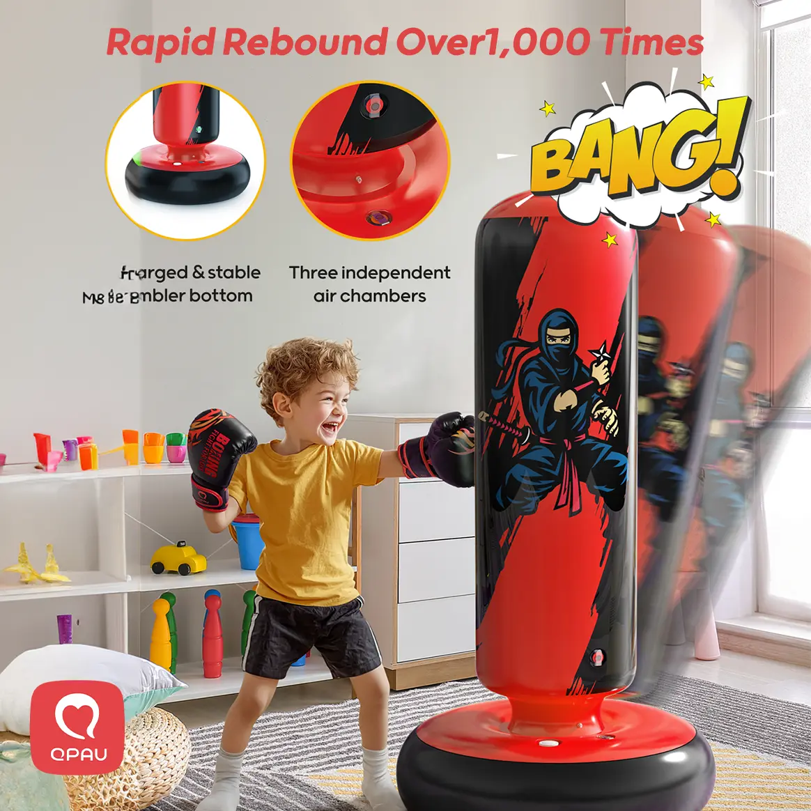 Equipped with three independent air chambers, the QPAU punching bag provides a fast rebound. Whether punching or kicking, the bag instantly returns to its original shape. This feature enhances the boxing experience, making every session dynamic and engaging for young fighters aged 5 to 12.