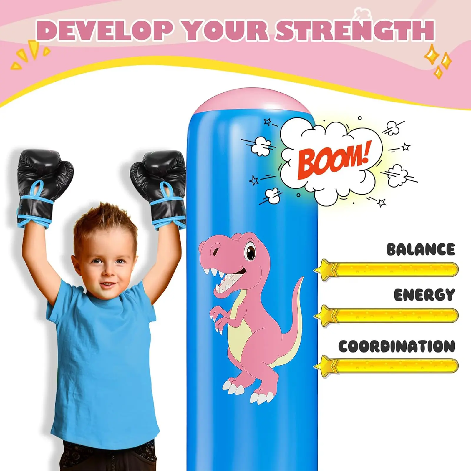 Promotes Growth and Development - Balance, Strength, and Coordination: The simple act of hitting, kicking, and punching the inflatable punching bag helps kids develop these essential skills. - Reducing Tension and Confidence: Using the punching bag during playtime helps kids reduce tension and develop confidence.