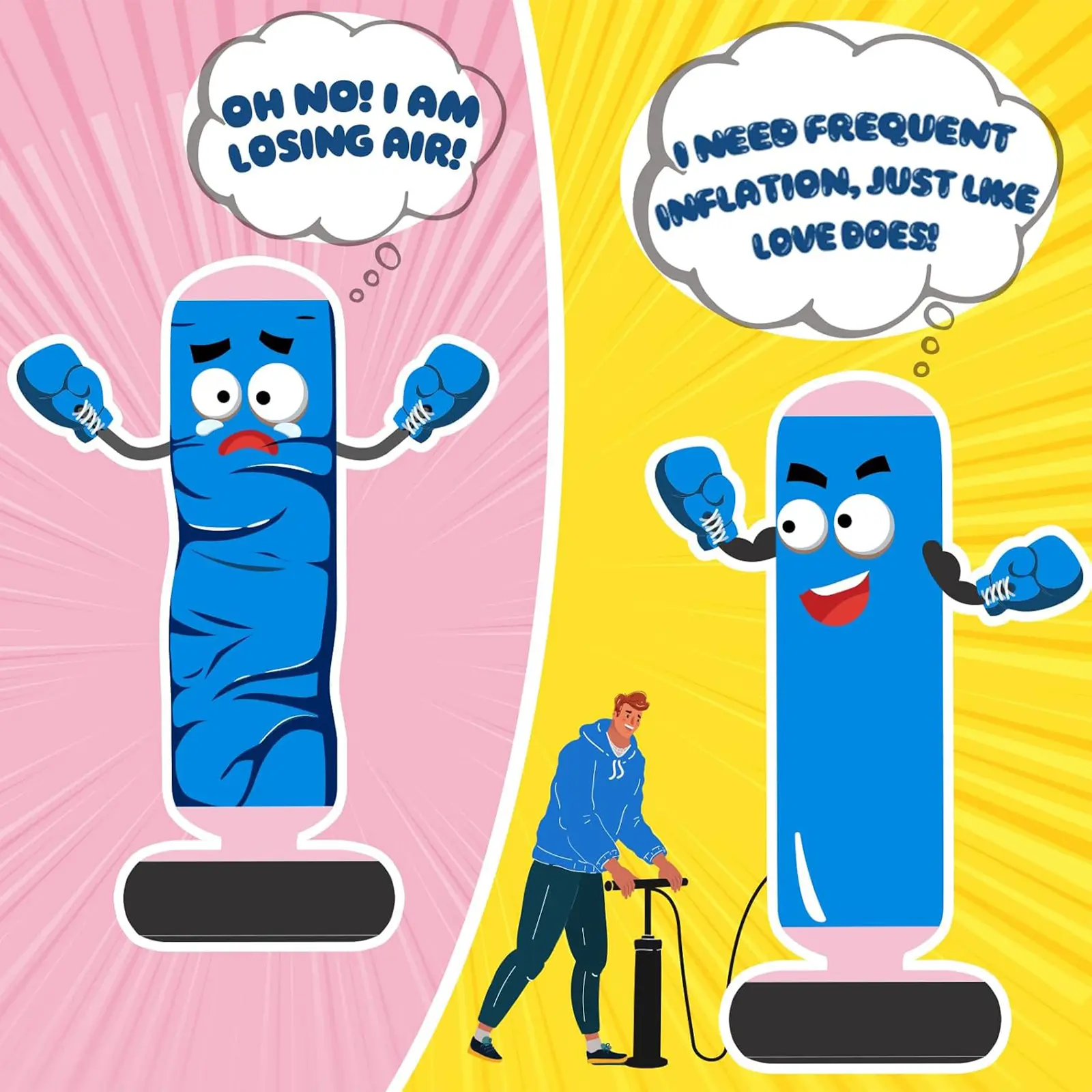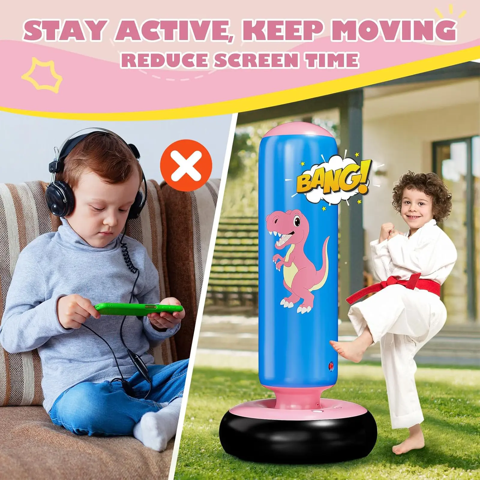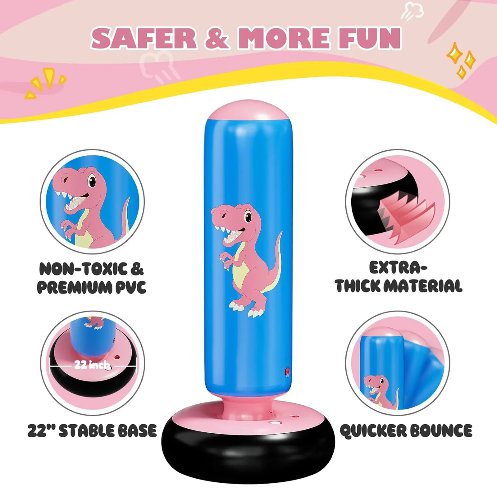 Ideal for Family Bonding - Indoor and Outdoor Play: The punching bag is perfect for both indoor and outdoor play areas, making it ideal for family bonding. - Quality Material: Made of PVC with 0.5mm thick material, the punching bag is durable and maintains a clean surface even after over 10,000 strikes.